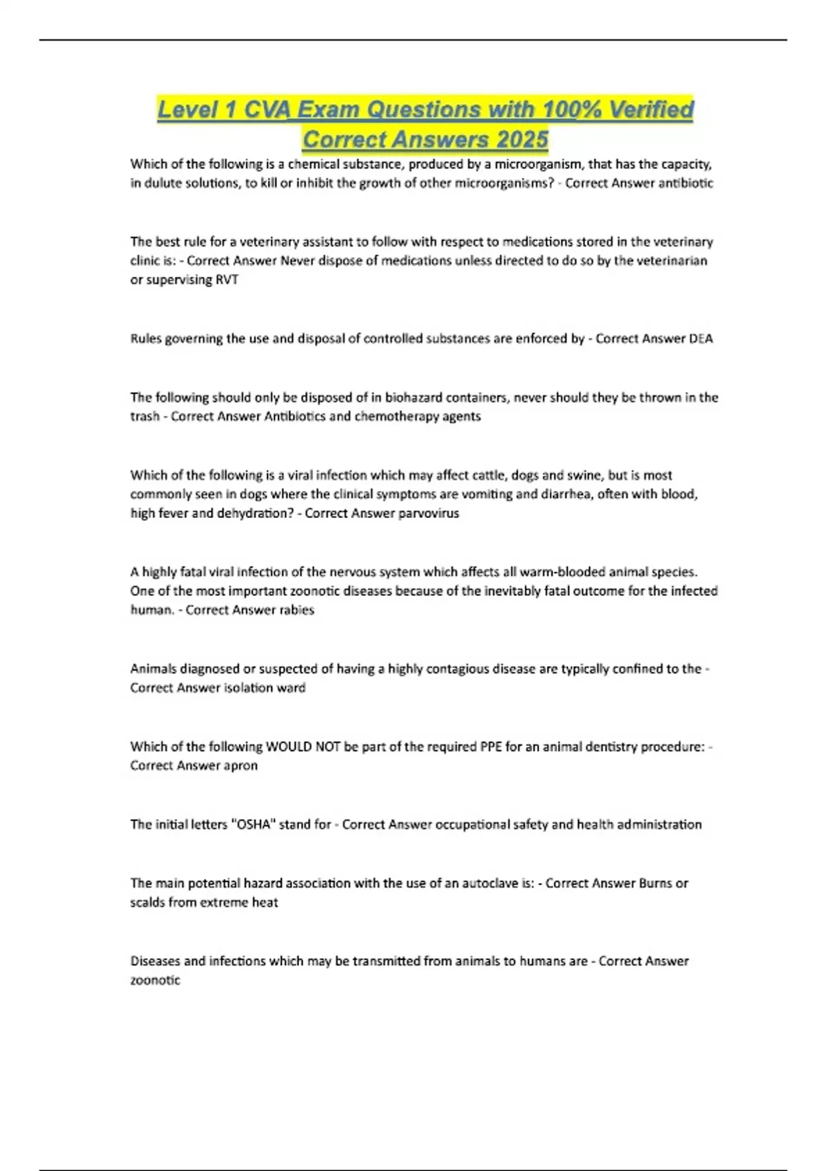 Level 1 CVA Exam Questions with 100% Verified Correct Answers 2025 Which of the following is a chemical substance, produced by a microorganism, that has the capacity, in dulute solutions, to kill or inhibit the growth of other microorganisms? - Correct Answer antibiotic The best rule for a veterinary assistant to follow with respect to medications stored in the veterinary clinic is: - Correct Answer Never dispose of medications unless directed to do so by the veterinarian or supervising RVT Rules governing the use and disposal of controlled substances are enforced by - Correct Answer DEA The following should only be disposed of in biohazard containers, never should they be thrown in the trash - Correct Answer Antibiotics and chemotherapy agents Which of the following is a viral infection which may affect cattle, dogs and swine, but is most commonly seen in dogs where the clinical symptoms are vomiting and diarrhea, often with blood, high fever and dehydration? - Correct Answer parvovirus A highly fatal viral infection of the nervous system which affects all warm-blooded animal species. One of the most important zoonotic diseases because of the inevitably fatal outcome for the infected human. - Correct Answer rabies Animals diagnosed or suspected of having a highly contagious disease are typically confined to the - Correct Answer isolation ward Which of the following WOULD NOT be part of the required PPE for an animal dentistry procedure: - Correct Answer apron The initial letters "OSHA" stand for - Correct Answer occupational safety and health administration The main potential hazard association with the use of an autoclave is: - Correct Answer Burns or scalds from extreme heat Diseases and infections which may be transmitted from animals to humans are - Correct Answer zoonotic
