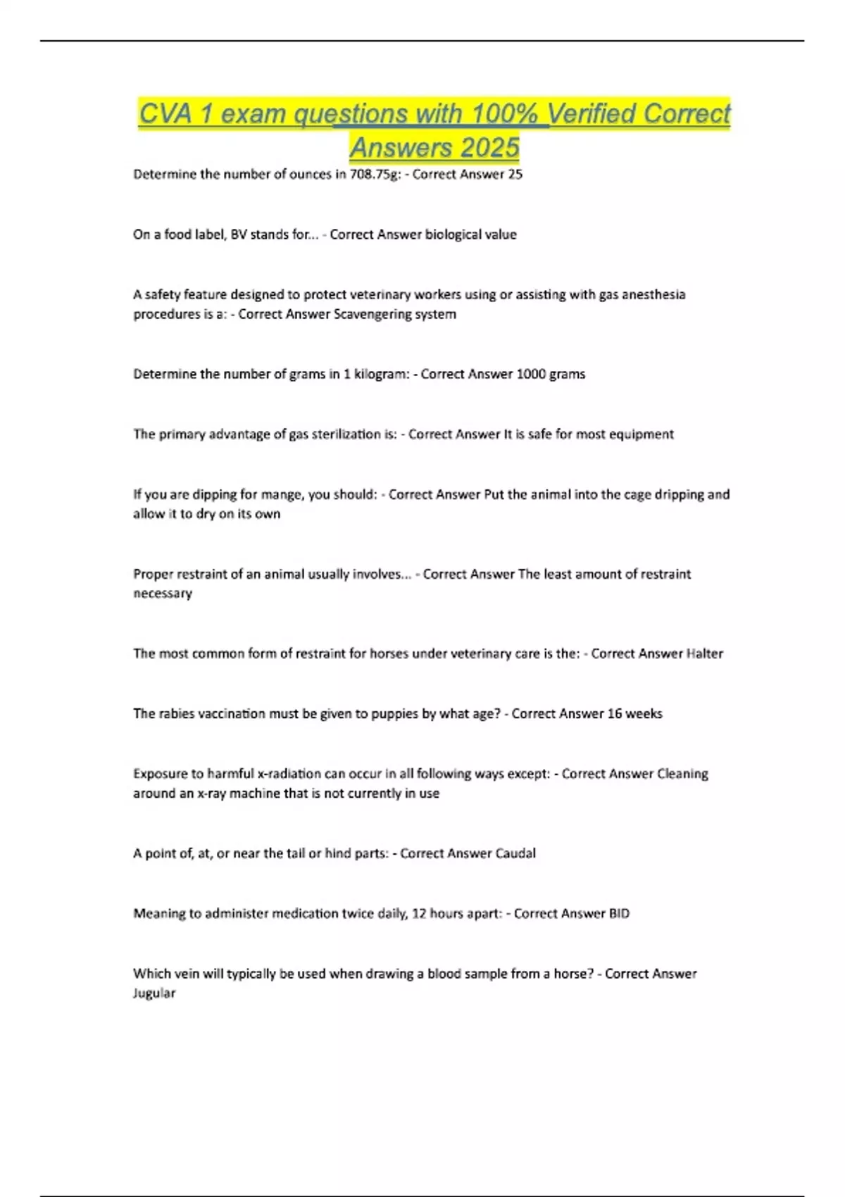 CVA 1 exam questions with 100% Verified Correct Answers 2025 Determine the number of ounces in 708.75g: - Correct Answer 25 On a food label, BV stands for... - Correct Answer biological value A safety feature designed to protect veterinary workers using or assisting with gas anesthesia procedures is a: - Correct Answer Scavengering system Determine the number of grams in 1 kilogram: - Correct Answer 1000 grams The primary advantage of gas sterilization is: - Correct Answer It is safe for most equipment If you are dipping for mange, you should: - Correct Answer Put the animal into the cage dripping and allow it to dry on its own Proper restraint of an animal usually involves... - Correct Answer The least amount of restraint necessary The most common form of restraint for horses under veterinary care is the: - Correct Answer Halter The rabies vaccination must be given to puppies by what age? - Correct Answer 16 weeks Exposure to harmful x-radiation can occur in all following ways except: - Correct Answer Cleaning around an x-ray machine that is not currently in use A point of, at, or near the tail or hind parts: - Correct Answer Caudal Meaning to administer medication twice daily, 12 hours apart: - Correct Answer BID Which vein will typically be used when drawing a blood sample from a horse? - Correct Answer Jugular