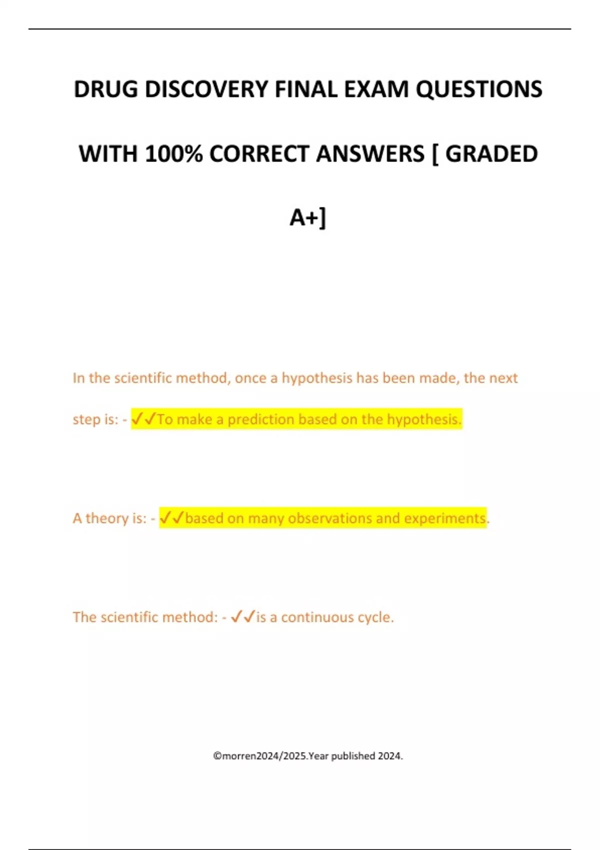 DRUG DISCOVERY FINAL EXAM QUESTIONS WITH 100% CORRECT ANSWERS [ GRADED A+] In the scientific method, once a hypothesis has been made, the next step is: - To make a prediction based on the hypothesis. A theory is: - based on many observations and experiments. The scientific method: - is a continuous cycle. ©morren2024/2025.Year published 2024. Laws of nature have been tested extensively and seem to apply everywhere in the universe. T or F? - True. The first clinical trial addressed: - Scurvy. Scurvy occurs because of deficiency in - Vitamin C. Pellagra occurs because of deficiency in - Vitamin B3 Clinical trial of Patulin - First introduced placebo to the world. The cost of a new drug (from research through FDA approval) is - More than $1 billion ©morren2024/2025.Year published 2024.
