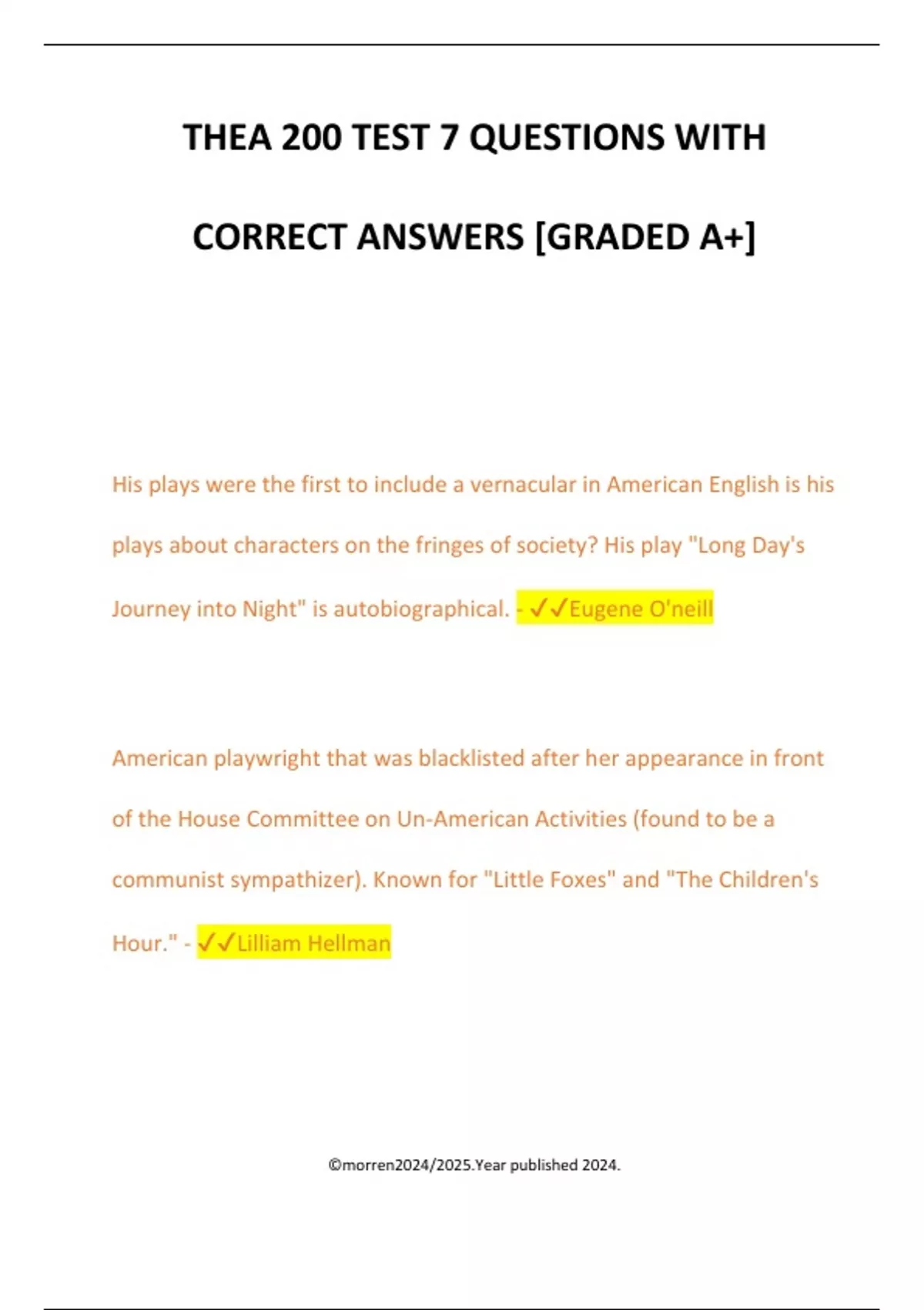 THEA 200 TEST 7 QUESTIONS WITH CORRECT ANSWERS [GRADED A+] His plays were the first to include a vernacular in American English is his plays about characters on the fringes of society? His play "Long Day's Journey into Night" is autobiographical. - Eugene O'neill American playwright that was blacklisted after her appearance in front of the House Committee on Un-American Activities (found to be a communist sympathizer). Known for "Little Foxes" and "The Children's Hour." - Lilliam Hellman ©morren2024/2025.Year published 2024. American playwright known for "The Crucible" which is an allegorical play set during the Salem Witch Trials. He testified in front of the House of Un-American Activities. He also wrote "Death of a Salesman". - Author Miller American playwright that wrote plays, now considered by some as "Southern Gothic." His play, "The Glass Menagerie" is an autobiographical play. - Tennessee Williams American playwright who wrote "The Pittsburg Cycle" which depicts African American communities and families in different decades. - August Wilson ©morren2024/2025.Year published 2024.