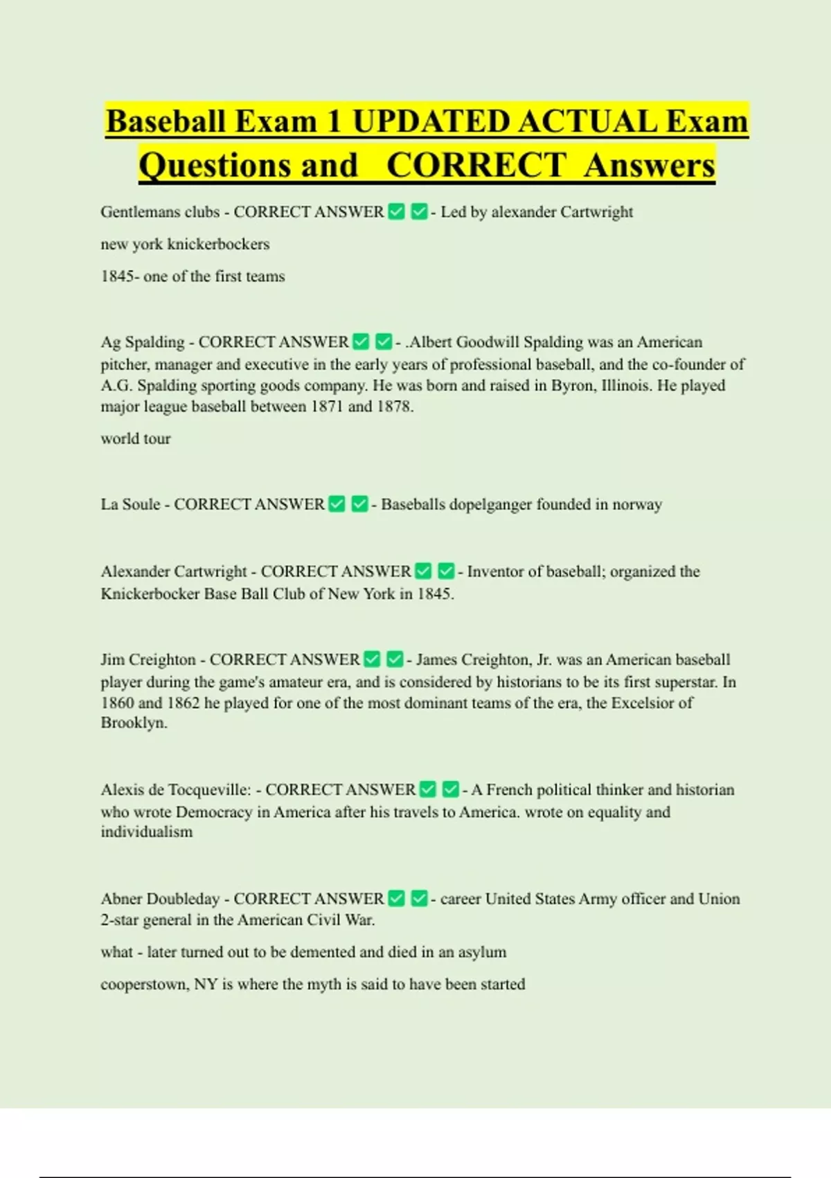 Baseball Exam 1 UPDATED ACTUAL Exam Questions and CORRECT Answers Gentlemans clubs - CORRECT ANSWER - Led by alexander Cartwright new york knickerbockers 1845- one of the first team