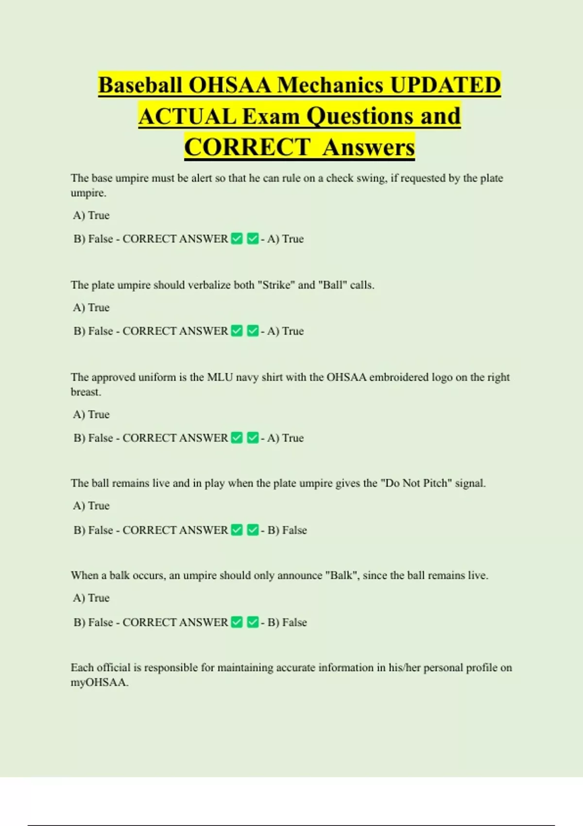Baseball OHSAA Mechanics UPDATED ACTUAL Exam Questions and CORRECT Answers The base umpire must be alert so that he can rule on a check swing, if requested by the plate umpire. A) True B) False - CORRECT ANSWER - A) True The plate umpire should verbalize both "Strike" and "Ball" cal