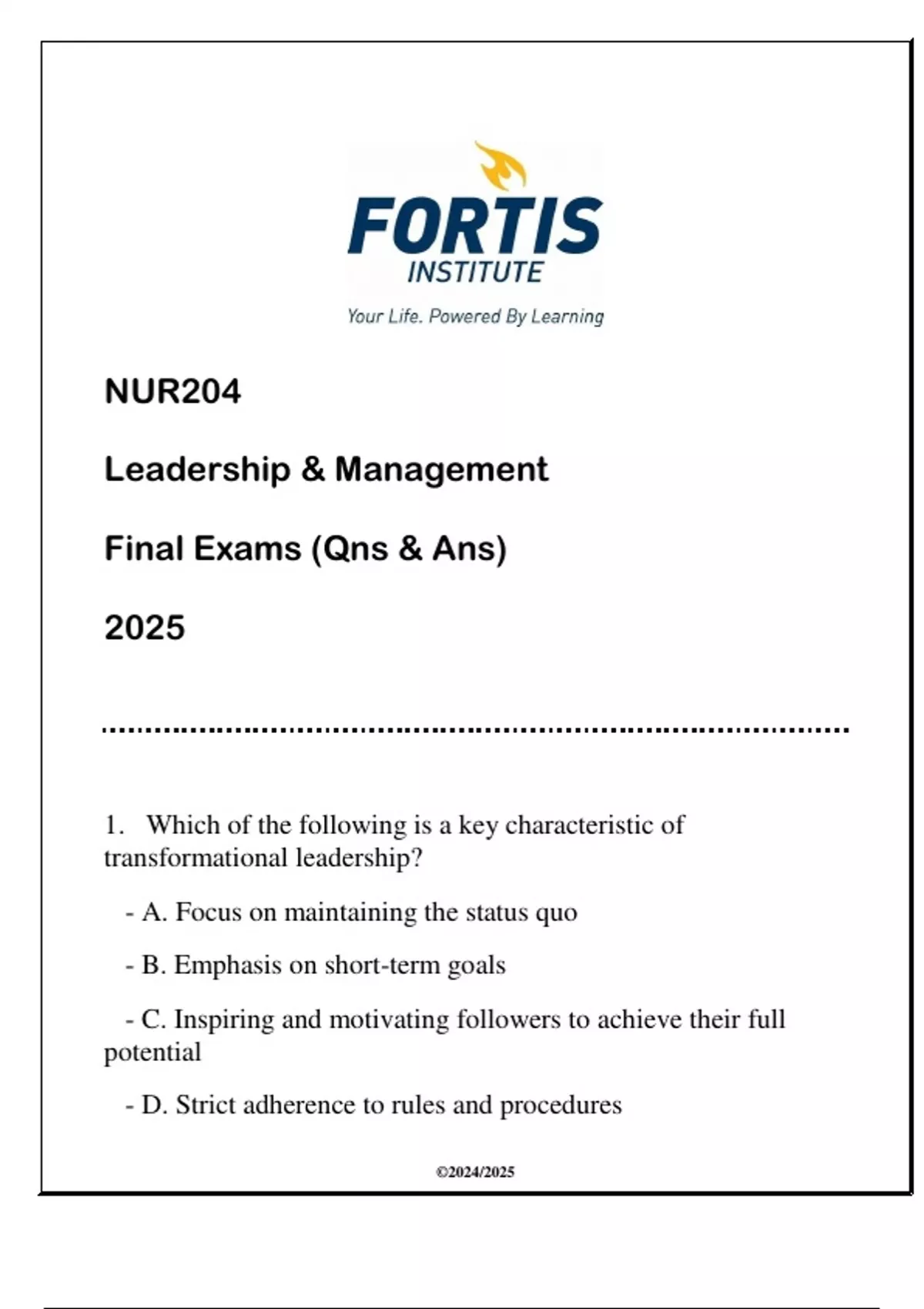 NUR204 (Fortis) Leadership & Management Final Exam (Qns & Ans) 2025.NUR204 (Fortis) Leadership & Management Final Exam (Qns & Ans) 2025.NUR204 (Fortis) Leadership & Management Final Exam (Qns & Ans) 2025.