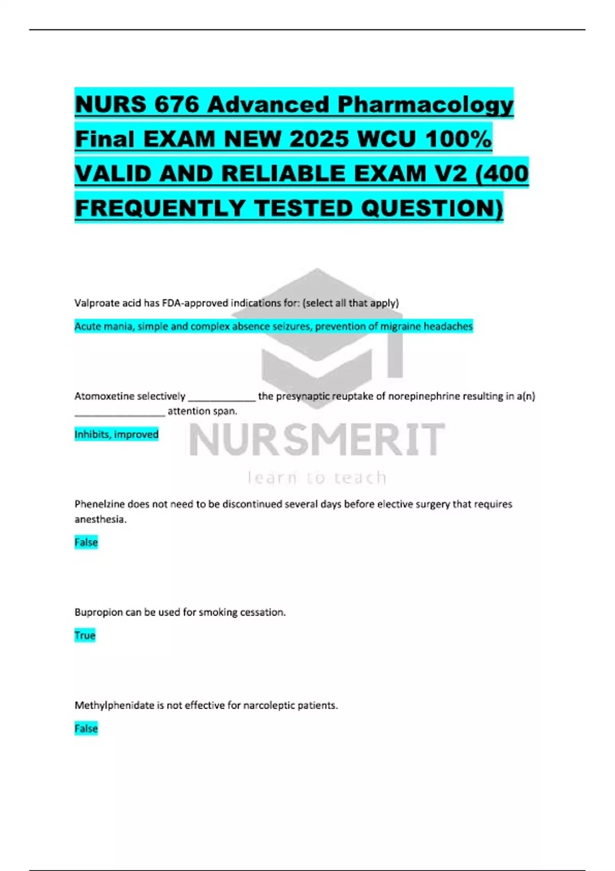NURS 676 Advanced Pharmacology Final EXAM NEW 2025 WCU 100% VALID AND RELIABLE EXAM V2 (400 FREQUENTLY TESTED QUESTION)