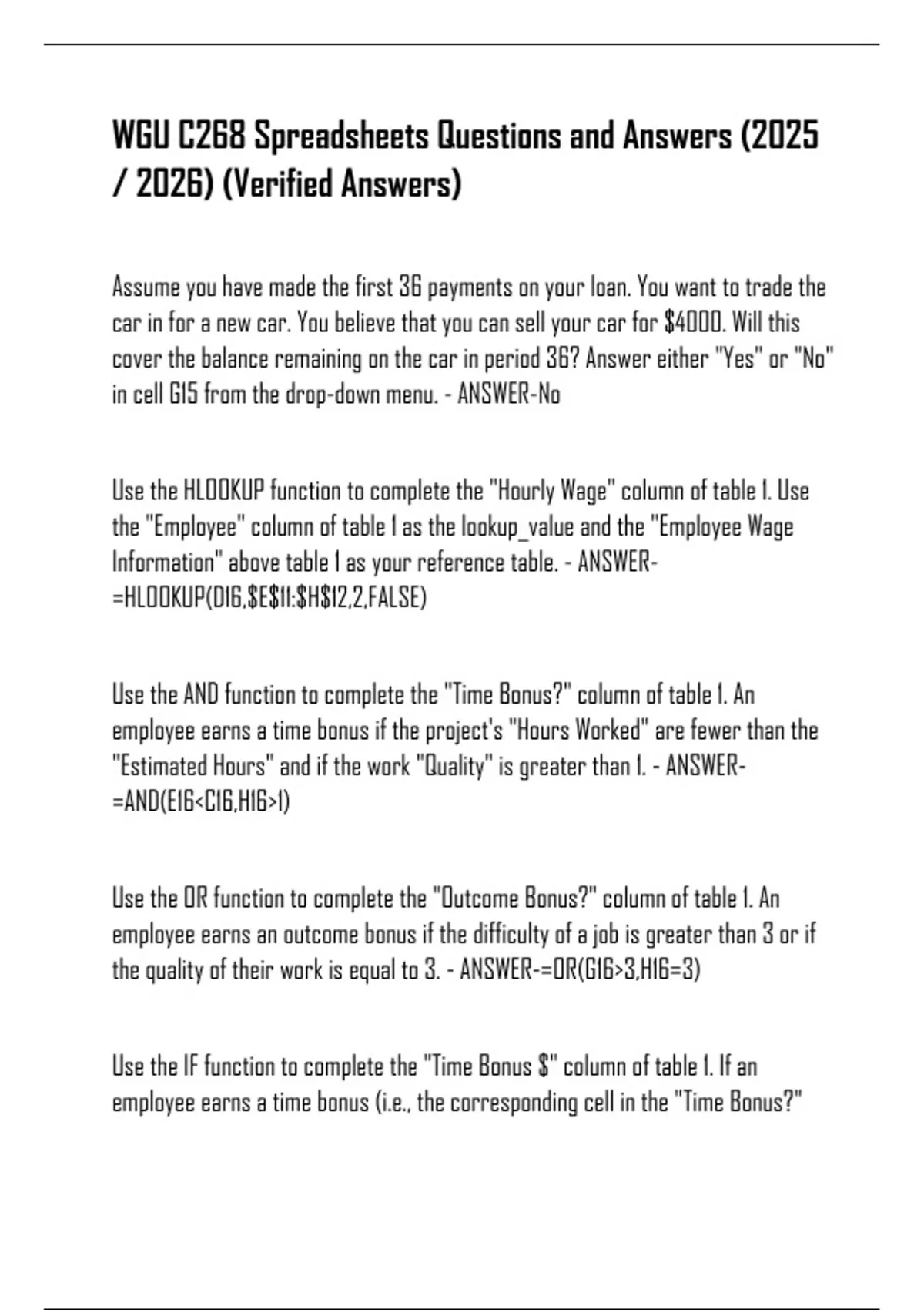 WGU C268 Spreadsheets Questions and Answers (2025 / 2026) (Verified Answers) Assume you have made the first 36 payments on your loan. You want to trade the car in for a new car. You believe that you can sell your car for $4000. Will this cover the balance remaining on the car in period 36? Answer either "Yes" or "No" in cell G15 from the drop-down menu. - ANSWER-No Use the HLOOKUP function to complete the "Hourly Wage" column of table 1. Use the "Employee" column of table 1 as the lookup_value and the "Employee Wage Information" above table 1 as your reference table. - ANSWER- =HLOOKUP(D16,$E$11:$H$12,2,FALSE) Use the AND function to complete the "Time Bonus?" column of table 1. An employee earns a time bonus if the project's "Hours Worked" are fewer than the "Estimated Hours" and if the work "Quality" is greater than 1. - ANSWER- =AND(E16C16,H161) Use the OR function to complete the "Outcome Bonus?" column of table 1. An employee earns an outcome bonus if the difficulty of a job is greater tha