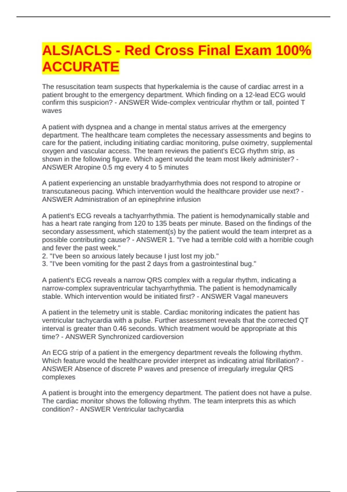 ALS/ACLS - Red Cross Final Exam 100% ACCURATE