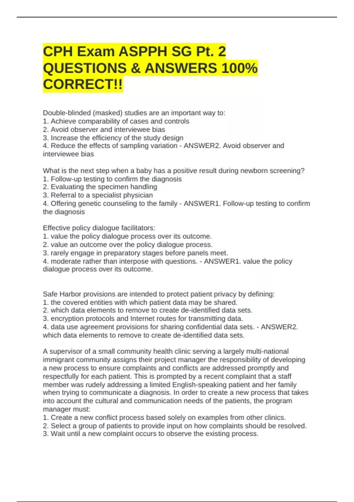 Double-blinded (masked) studies are an important way to: 1. Achieve comparability of cases and controls 2. Avoid observer and interviewee bias 3. Increase the efficiency of the study design 4. Reduce the effects of sampling variation - ANSWER2. Avoid observer and interviewee bias What is the next step when a baby has a positive result during newborn screening? 1. Follow-up testing to confirm the diagnosis 2. Evaluating the specimen handling 3. Referral to a specialist physician 4. Offering genetic counseling to the family - ANSWER1. Follow-up testing to confirm the diagnosis Effective policy dialogue facilitators: 1. value the policy dialogue process over its outcome. 2. value an outcome over the policy dialogue process. 3. rarely engage in preparatory stages before panels meet. 4. moderate rather than interpose with questions. - ANSWER1. value the policy dialogue process over its outcome. Safe Harbor provisions are intended to protect patient privacy by defining: 1. the covered entities with which patient data may be shared. 2. which data elements to remove to create de-identified data sets. 3. encryption protocols and Internet routes for transmitting data. 4. data use agreement provisions for sharing confidential data sets. - ANSWER2. which data elements to remove to create de-identified data sets. A supervisor of a small community health clinic serving a largely multi-national immigrant community assigns their project manager the responsibility of developing a new process to ensure complaints and conflicts are addressed promptly and respectfully for each patient. This is prompted by a recent complaint that a staff member was rudely addressing a limited English-speaking patient and her family when trying to communicate a diagnosis. In order to create a new process that takes into account the cultural and communication needs of the patients, the program manager must: 1. Create a new conflict process based solely on examples from other clinics. 2. Select a group of patients to provide input on how complaints should be resolved. 3. Wait until a new complaint occurs to observe the existing process. 4. Ask their coworkers how they personally deal with complaints and conflicts in the office. - ANSWER2. Select a group of patients to provide input on how complaints should be resolved. Informed consent should avoid inclusion of: 1. risks and benefits 2. technical jargon 3. contact information 4. purpose - ANSWER2. technical jargon Waiting until a program or intervention is complete to begin evaluation activities misses important and valuable opportunities for what type of evaluation? 1. Outcome and impact evaluation 2. Summative evaluation 3. Process evaluation 4. Participant evaluation - ANSWER3. Process evaluation To determine whether to expand a component of a current intervention, which type of evaluation is needed? 1. Formative evaluation 2. Process evaluation 3. Outcome evaluation 4. Impact evaluation - ANSWER1. Formative evaluation The construct of n