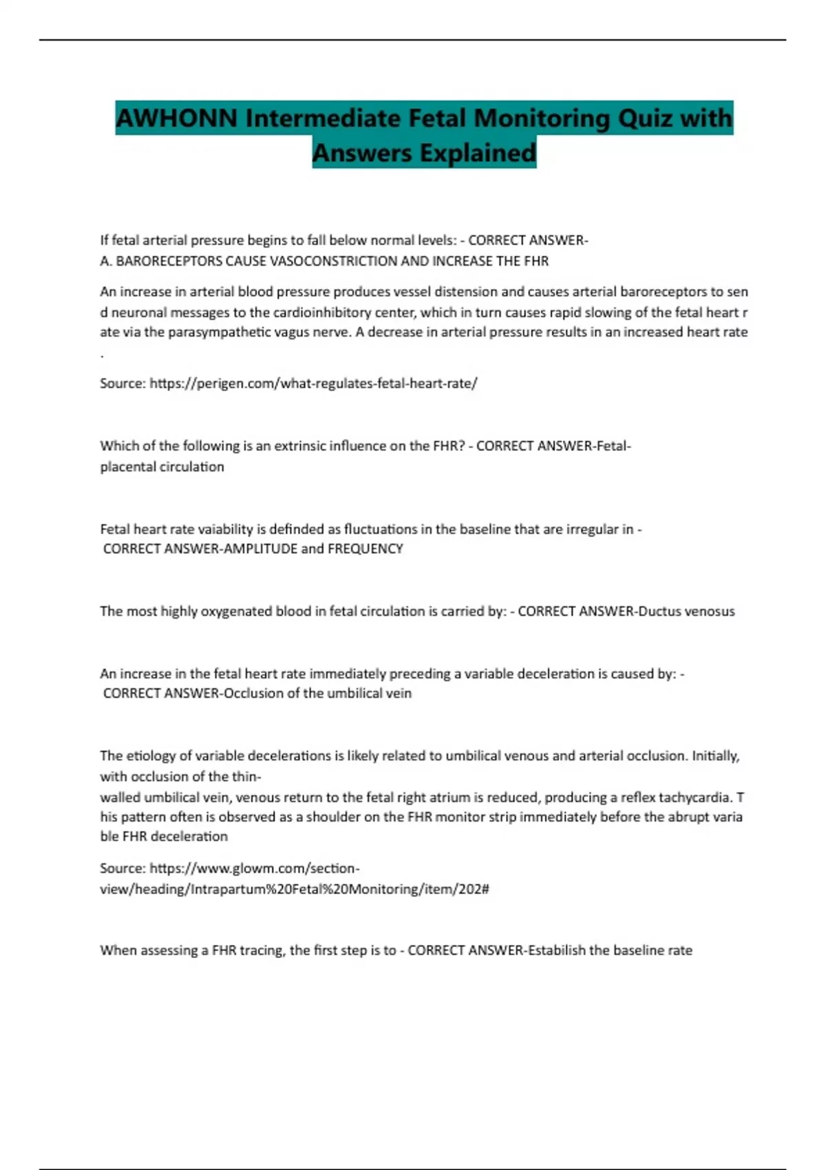 AWHONN Intermediate Fetal Monitoring Quiz with Answers Explained If fetal arterial pressure begins to fall below normal levels: - CORRECT ANSWER-A. BARORECEPTORS CAUSE VASOCONSTRICTION AND INCREASE THE FHR An increase in arterial blood pressure produces vessel distension and causes arterial baroreceptors to send neuronal messages to the cardioinhibitory center, which in turn causes rapid slowing of the fetal heart rate via the parasympathetic vagus nerve. A decrease in arterial pressure results in an increased heart rate. Source:z Which of the following is an extrinsic influence on the FHR? - CORRECT ANSWER-Fetal-placental circulation