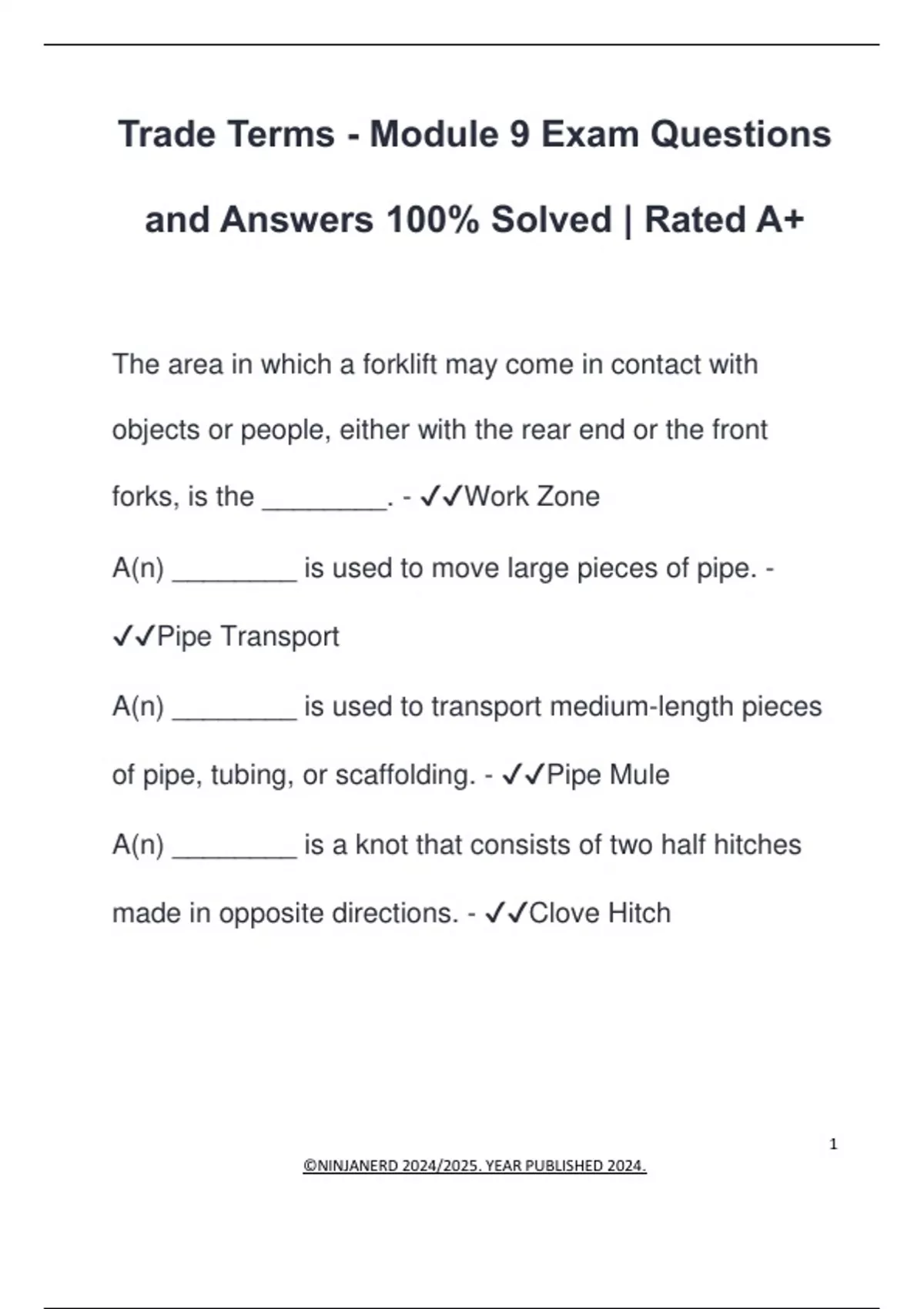 Trade Terms - Module 9 Exam Questions and Answers 100% Solved | Rated A+ The area in which a forklift may come in contact with objects or people, either with the rear end or the front forks, is the ________. - Work Zone A(n) ________ is used to move large pieces of pipe. - Pipe Transport A(n) ________ is used to transport medium-length pieces of pipe, tubing, or scaffolding. - Pipe Mule A(n) ________ is a knot that consists of two half hitches made in opposite directions. - Clove Hitch