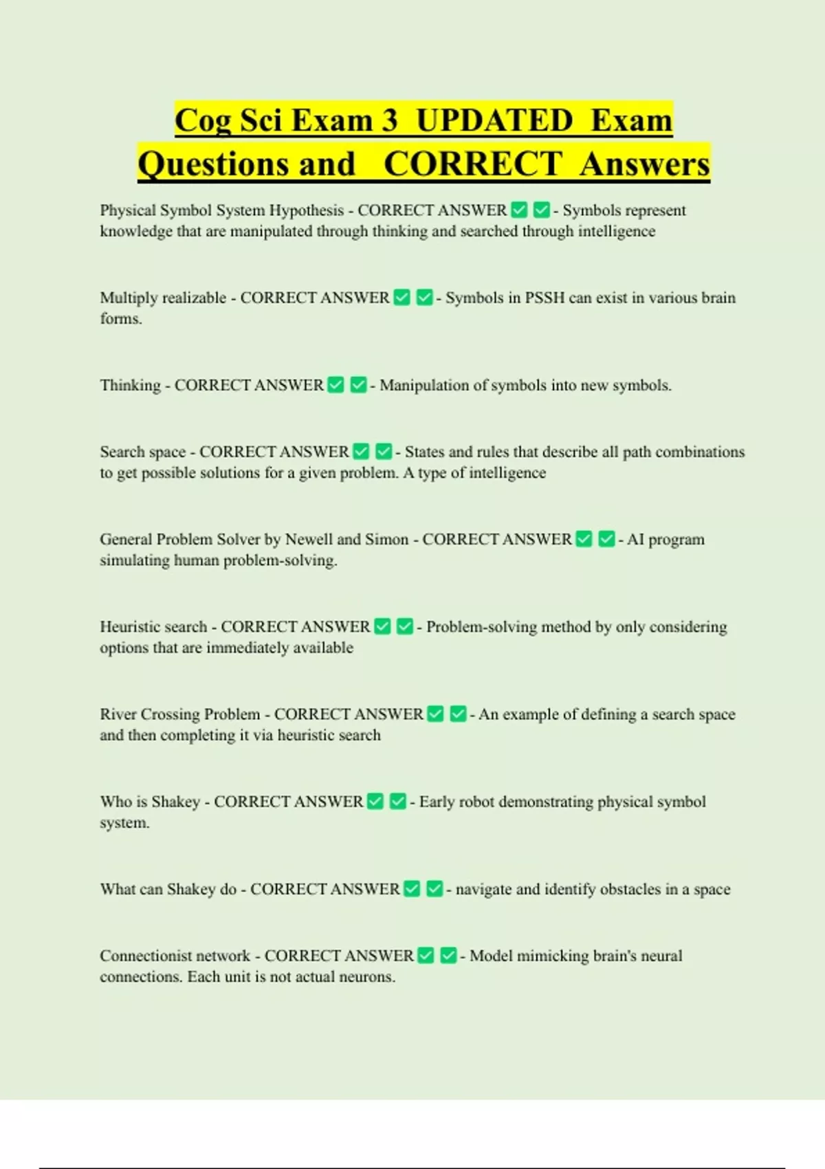 Cog Sci Exam 3 UPDATED Exam Questions and CORRECT Answers Physical Symbol System Hypothesis - CORRECT ANSWER - Symbols represent knowledge that are manipulated through thinking and searched through intelligence Multiply realizable - CORRECT ANSWER - Symbols in PSSH can exist in various brain forms