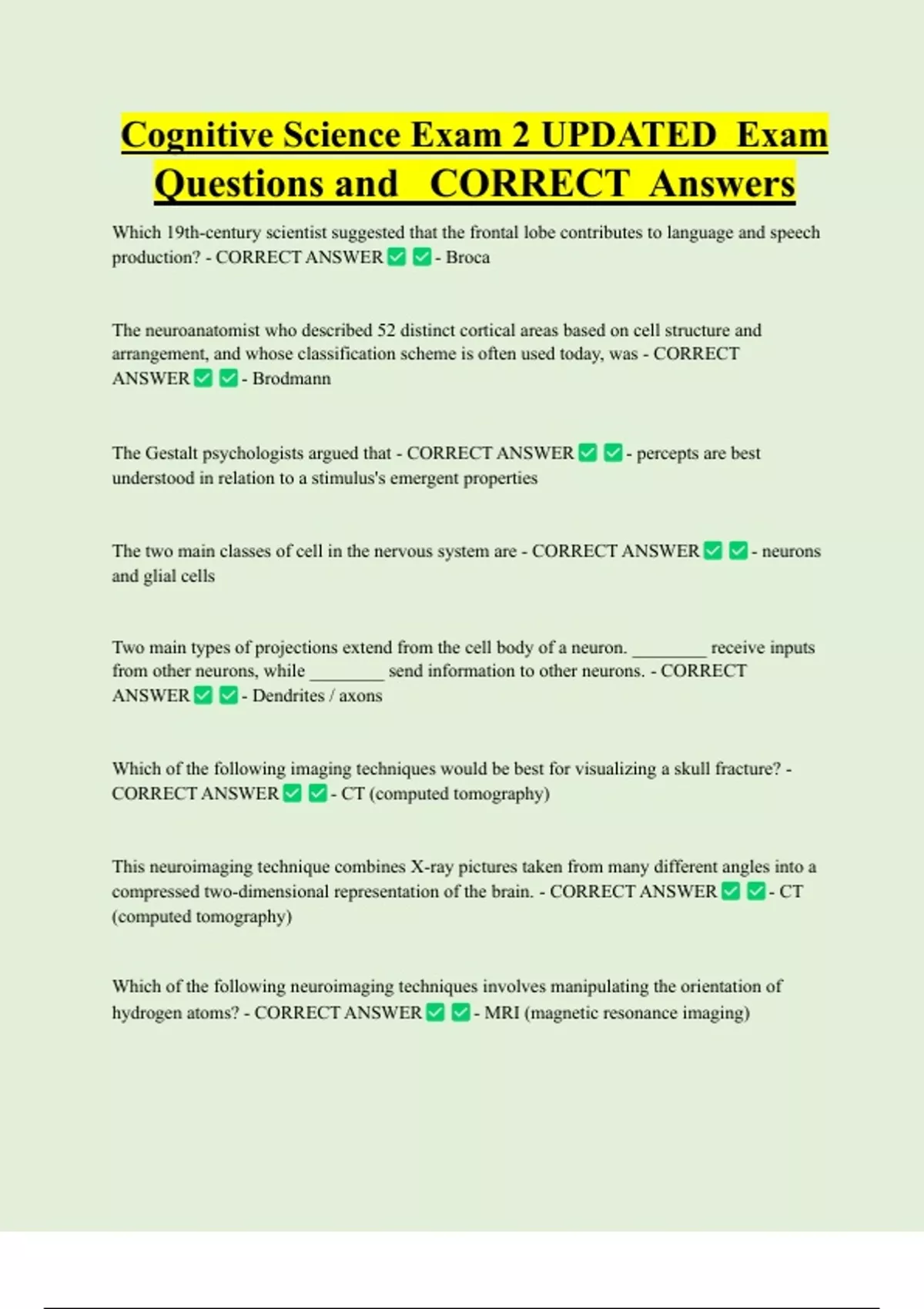 Cognitive Science Exam 2 UPDATED Exam Questions and CORRECT Answers Which 19th-century scientist suggested that the frontal lobe contributes to language and speech production? - CORRECT ANSWER - Broca The neuroanatomist who described 52 distinct cortical areas based on cell structure and arrangement, and whose classification scheme is often used today, was - CORRECT ANSWER - Brodmann