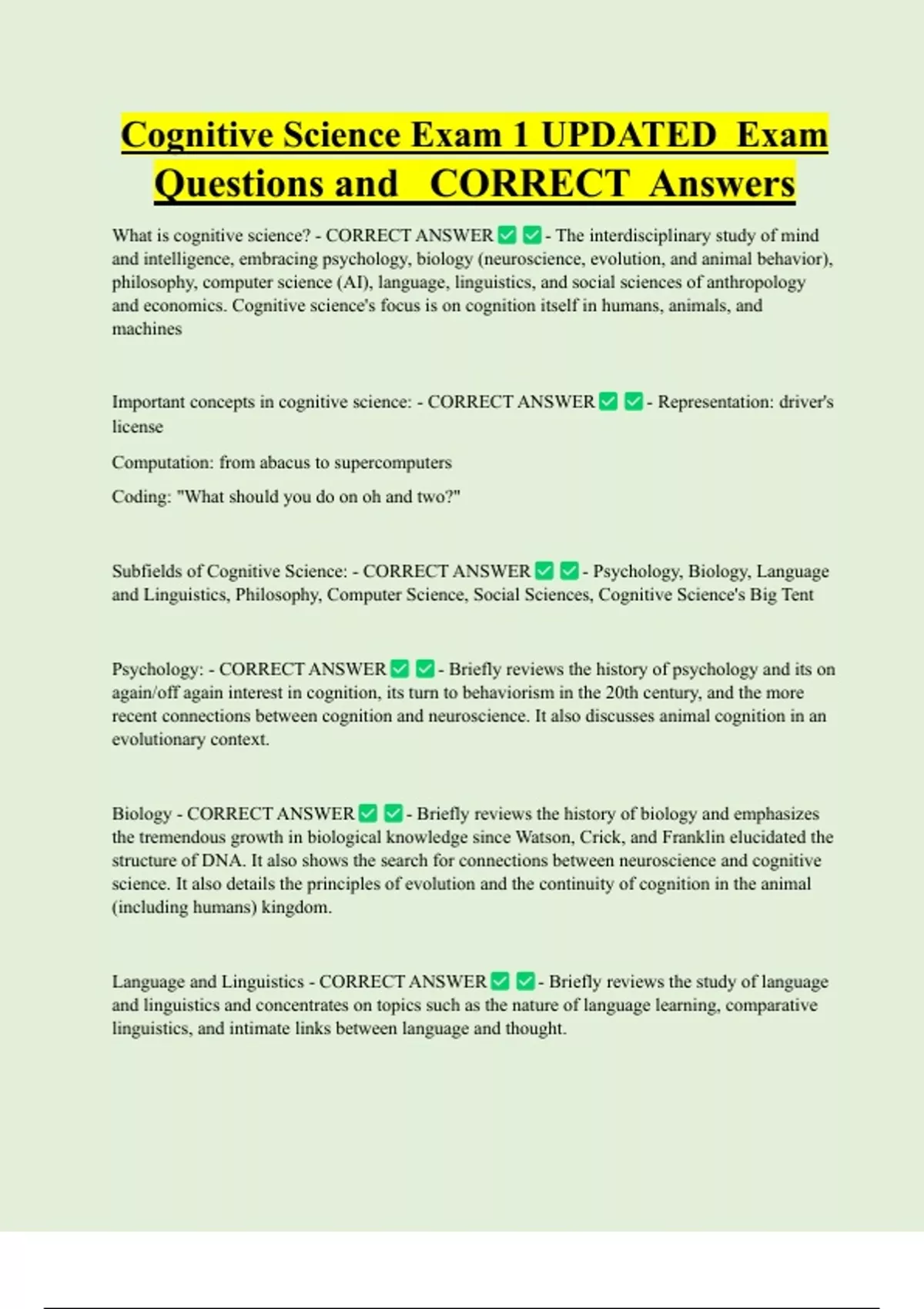 Cognitive Science Exam 1 UPDATED Exam Questions and CORRECT Answers What is cognitive science? - CORRECT ANSWER - The interdisciplinary study of mind and intelligence, embracing psychology, biology (neuroscience, evolution, and animal behavior), philosophy, computer science (AI), language, linguistics, and social sciences of anthropology and economics. Cognitive science's focus is on cognition itself in humans, animals, and machines