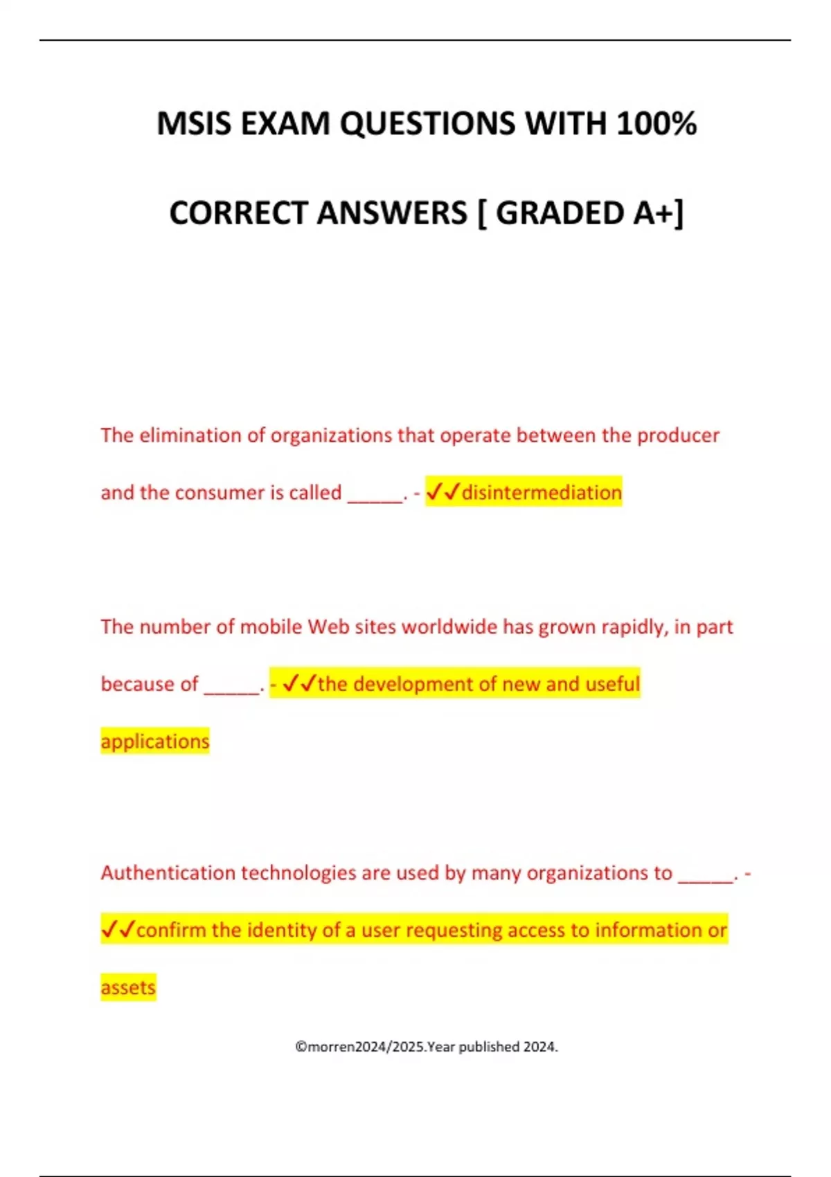 MSIS EXAM QUESTIONS WITH 100% CORRECT ANSWERS [ GRADED A+] The elimination of organizations that operate between the producer and the consumer is called _____. - disintermediation The number of mobile Web sites worldwide has grown rapidly, in part because of _____. - the development of new and useful applications Authentication technologies are used by many organizations to _____. - confirm the identity of a user requesting access to information or assets ©morren2024/2025.Year published 2024. Conversion to an e-commerce or m-commerce system enables organizations to _____. - improve their level of customer service How can a business best increase traffic to its e-commerce site? - acquire links to its site on popular, related sites Tom's Art Supplies used to sell art supplies through mail order catalogs, but the company's data entry specialists often had difficulty deciphering their customers' handwriting on the order forms. Since switching to an e-commerce site, Tom's has enjoyed which advantage of e-commerce? - increased order accuracy ©morren2024/2025.Year published 2024.