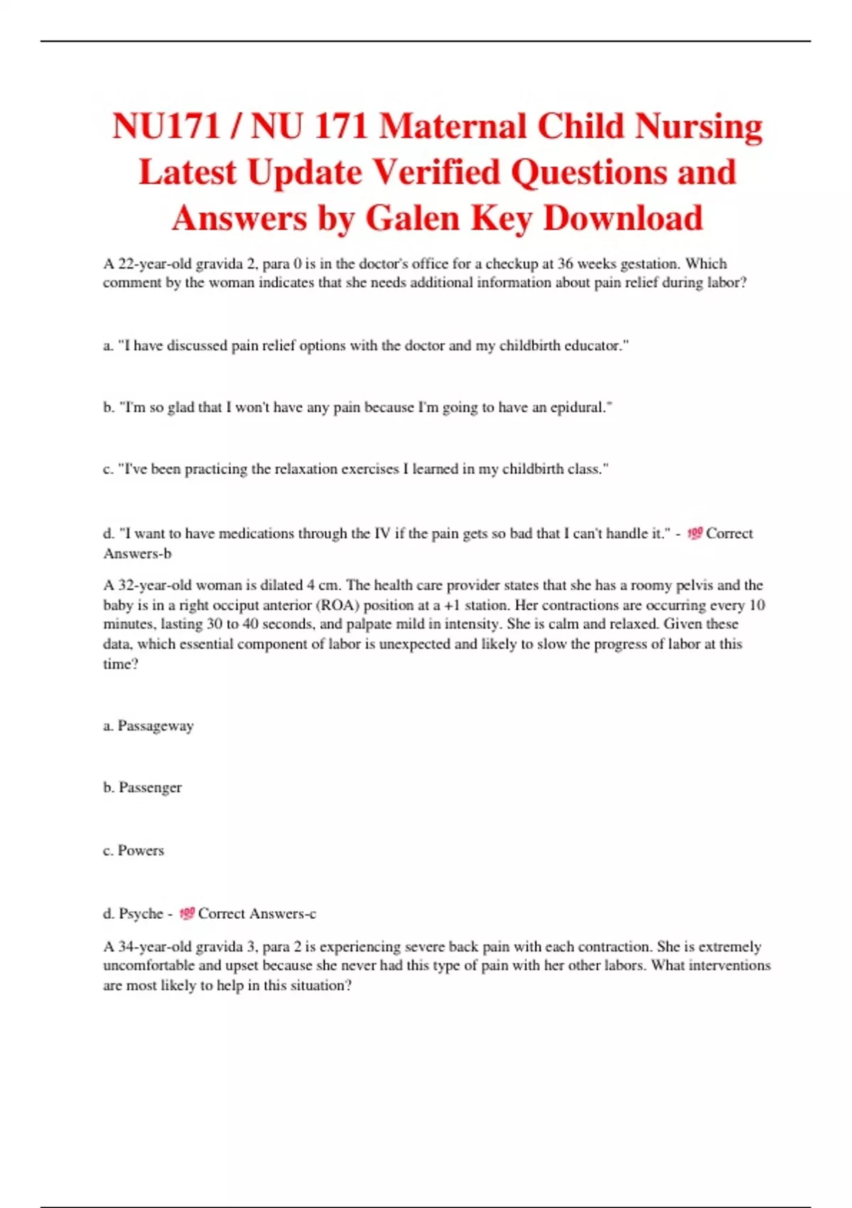 ,a. Comfort measures, intermittent labor support by the nurse, and reassurance that the pain is temporary