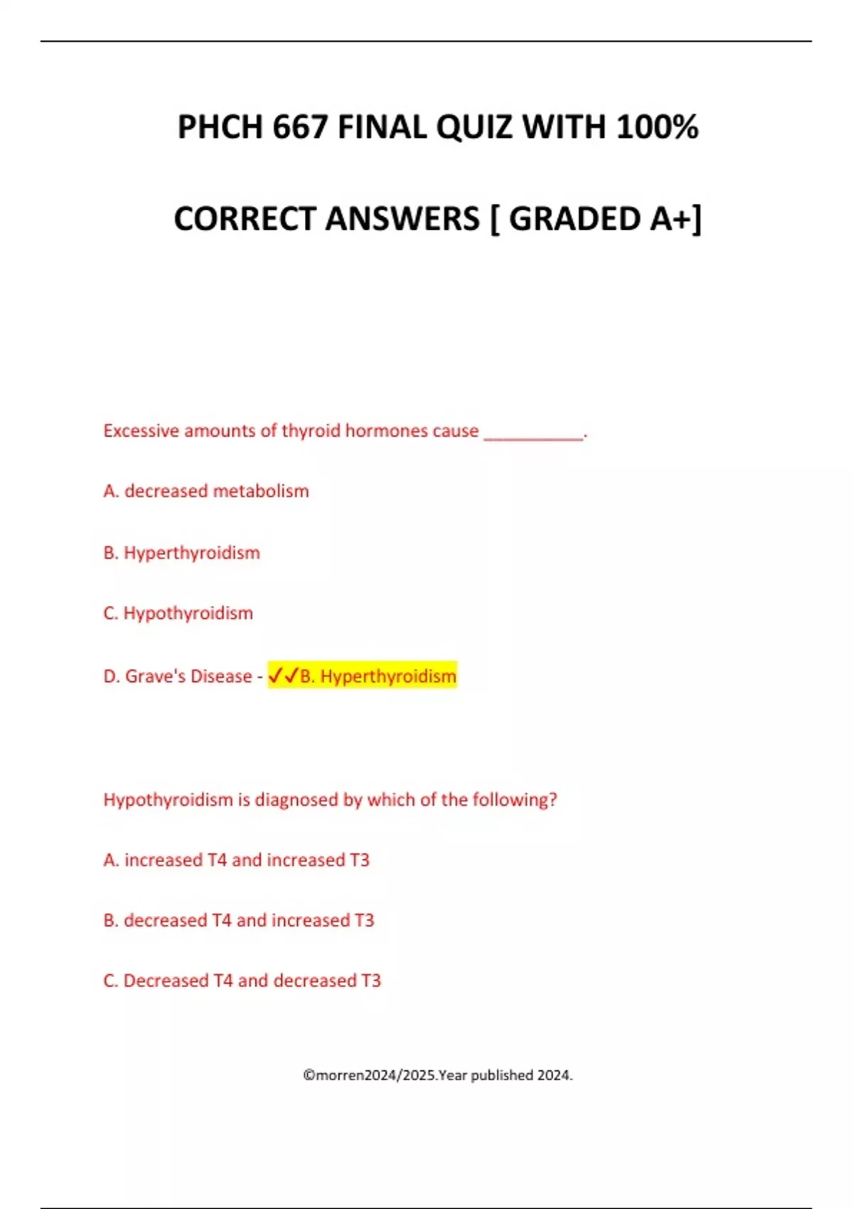 ,D. increased T4 and decreased T3 - ✔✔C. Decreased T4 and decreased T3