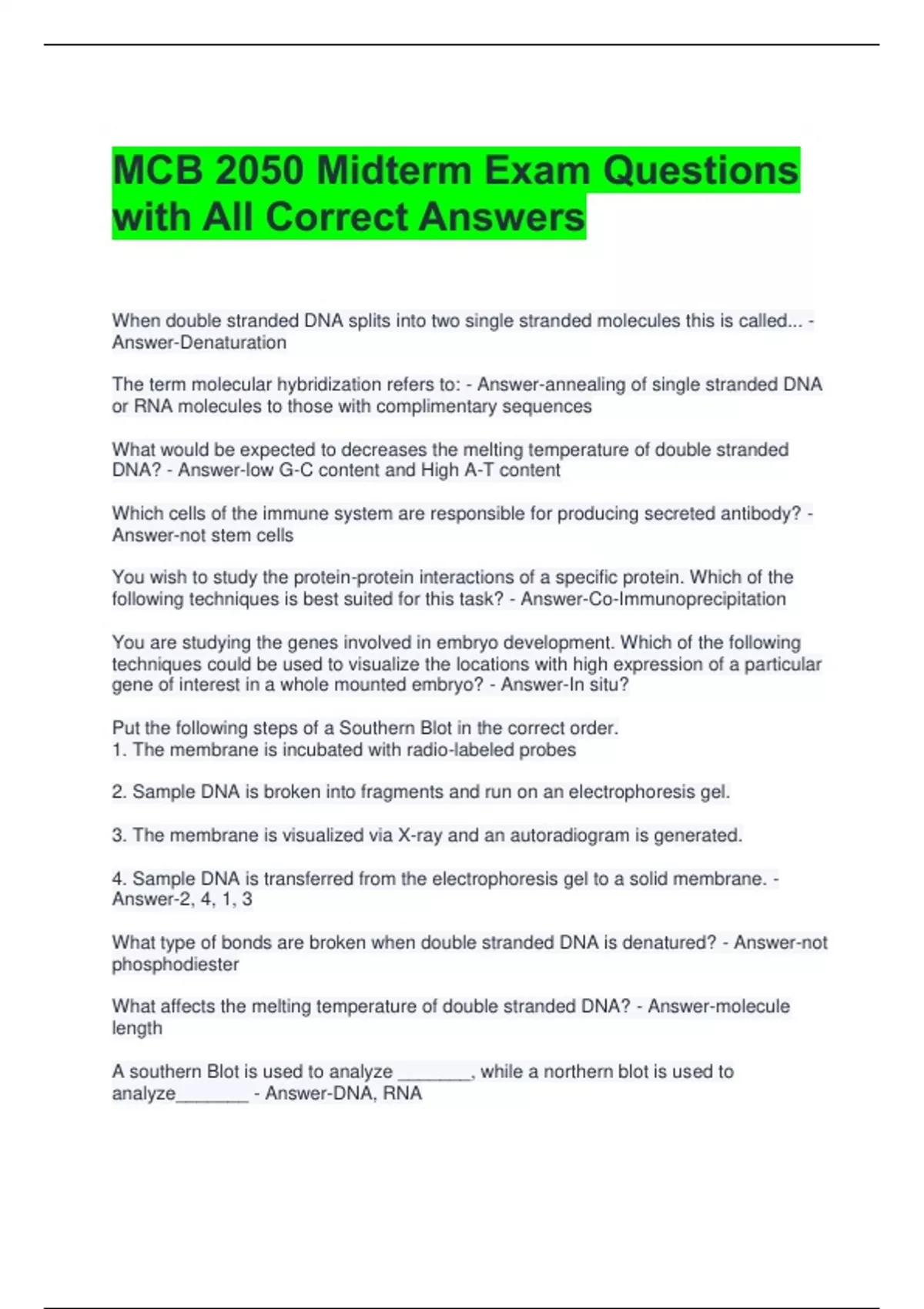 MCB 2050 Midterm Exam Questions with All Correct Answers When double stranded DNA splits into two single stranded molecules this is called... - Answer-Denaturation The term molecular hybridization refers to: - Answer-annealing of single stranded DNA or RNA molecules to those with complimentary sequences What would be expected to decreases the melting temperature of double stranded DNA? - Answer-low G-C content and High A-T content Which cells of the immune system are responsible for producing secreted antibody? - Answer-not stem cells You wish to study the protein-protein interactions of a specific protein. Which of the following techniques is best suited for this task? - Answer-Co-Immunoprecipitation You are studying the genes involved in embryo development. Which of the following techniques could be used to visualize the locations with high expression of a particular gene of interest in a whole mounted embryo? - Answer-In situ? Put the following steps of a Southern Blot in the correct order. 1. The membrane is incubated with radio-labeled probes 2. Sample DNA is broken into fragments and run on an electrophoresis gel. 3. The membrane is visualized via X-ray and an autoradiogram is generated. 4. Sample DNA is transferred from the electrophoresis gel to a solid membrane. - Answer-2, 4, 1, 3 What type of bonds are broken when double stranded DNA is denatured? - Answer-not phosphodiester What affects the melting temperature of double stranded DNA? - Answer-molecule length A southern Blot is used to analyze _______, while a northern blot is used to analyze_______ - Answer-DNA, RNA G-C base pairs contain ____ hydrogen bonds, while A-T pairs contain ____ - Answer-3, 2 Which technique could be used to produce a human karyotype? - Answer-Fluorescence in situ hybridization The spilceosome consists of: 1. snRPS 2. snRNAs 3. U1 4. U4 5. all of the above - Answer-all of the above The branch point A does not participate in base pairing with the ________ to allow for the first ________ reaction in RNA splicing via the ________ group of the branch point A. A. U1 snRNA; polymerization; 3' OH B. 3' splice site; debranching; 5' PO4 C. 3' splice site; transesterification; 3' OH D. U2 snRNA; transesterification; 2' OH E. U2 snRNA; debranching; 2' OH - Answer-D Place the following events of RNA splicing in the correct sequence: I. Formation of a 2' 5' phosphodiester bond between the branch point and 5' end of the intron II. The first transesterification reaction, catalyzed by U2 and U6 III. Recruitment of U3, U4, and U5 to the preRNA IV. Binding of SF1 to the branch point A V. Joining of the two exons via a 3' 5' phosphodiester bond A.IV, III, II, I, V B.III, IV, II, I, V C.IV, III, I, II, V D.III, IV, II, V, I E.II, IV, III, I, V - Answer-A What is splicing - Answer-joining of two exons and removal of an intron What are the master regulators called that control the events of the cell cycle? - Answer-Cyclin Dependent Kinases (CDK) What is the regulatory subunit of CDKs called? - Answer-cyclins