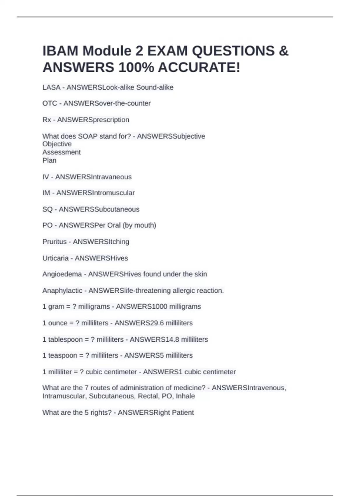 LASA - ANSWERSLook-alike Sound-alike OTC - ANSWERSover-the-counter Rx - ANSWERSprescription What does SOAP stand for? - ANSWERSSubjective Objective Assessment Plan IV - ANSWERSIntravaneous IM - ANSWERSIntromuscular SQ - ANSWERSSubcutaneous PO - ANSWERSPer Oral (by mouth) Pruritus - ANSWERSItching Urticaria - ANSWERSHives Angioedema - ANSWERSHives found under the skin Anaphylactic - ANSWERSlife-threatening allergic reaction. 1 gram = ? milligrams - ANSWERS1000 milligrams 1 ounce = ? milliliters - ANSWERS29.6 milliliters