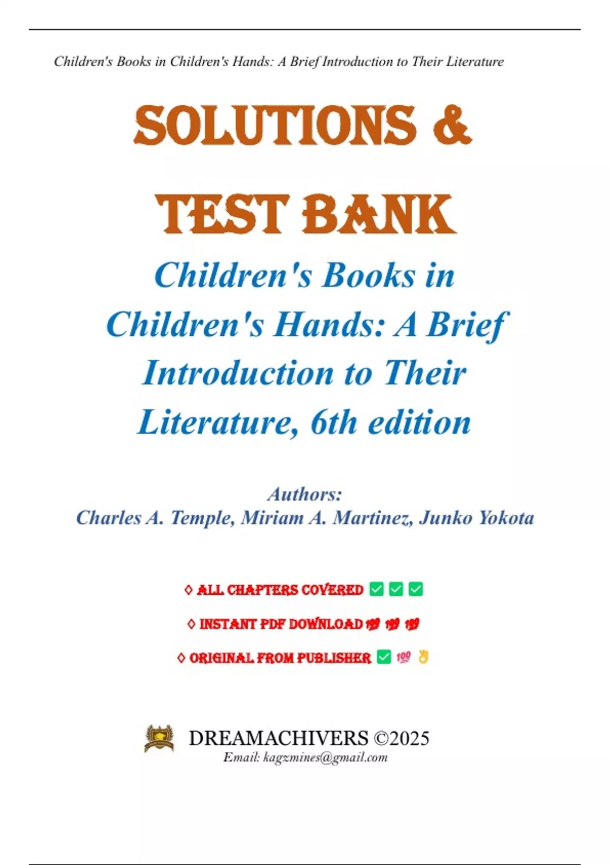 Solutions Manual and Test Bank For Children's Books in Children's Hands: A Brief Introduction to Their Literature 6th Edition by Charles A. Temple (All Chapters 1-11). PART I: UNDERSTANDING LITERATURE AND THE CHILD READER Children’s Books in Children’s Hands Literary Elements in Works for Children Picturebooks Literature Representing Diverse Perspectives International Literature PART II: EXPLORING THE GENRES OF CHILDREN’S LITERATURE Poetry for Children Traditional Literature Modern Fantasy and Science Fiction Contemporary Realistic Fiction Historical Fiction Nonfiction