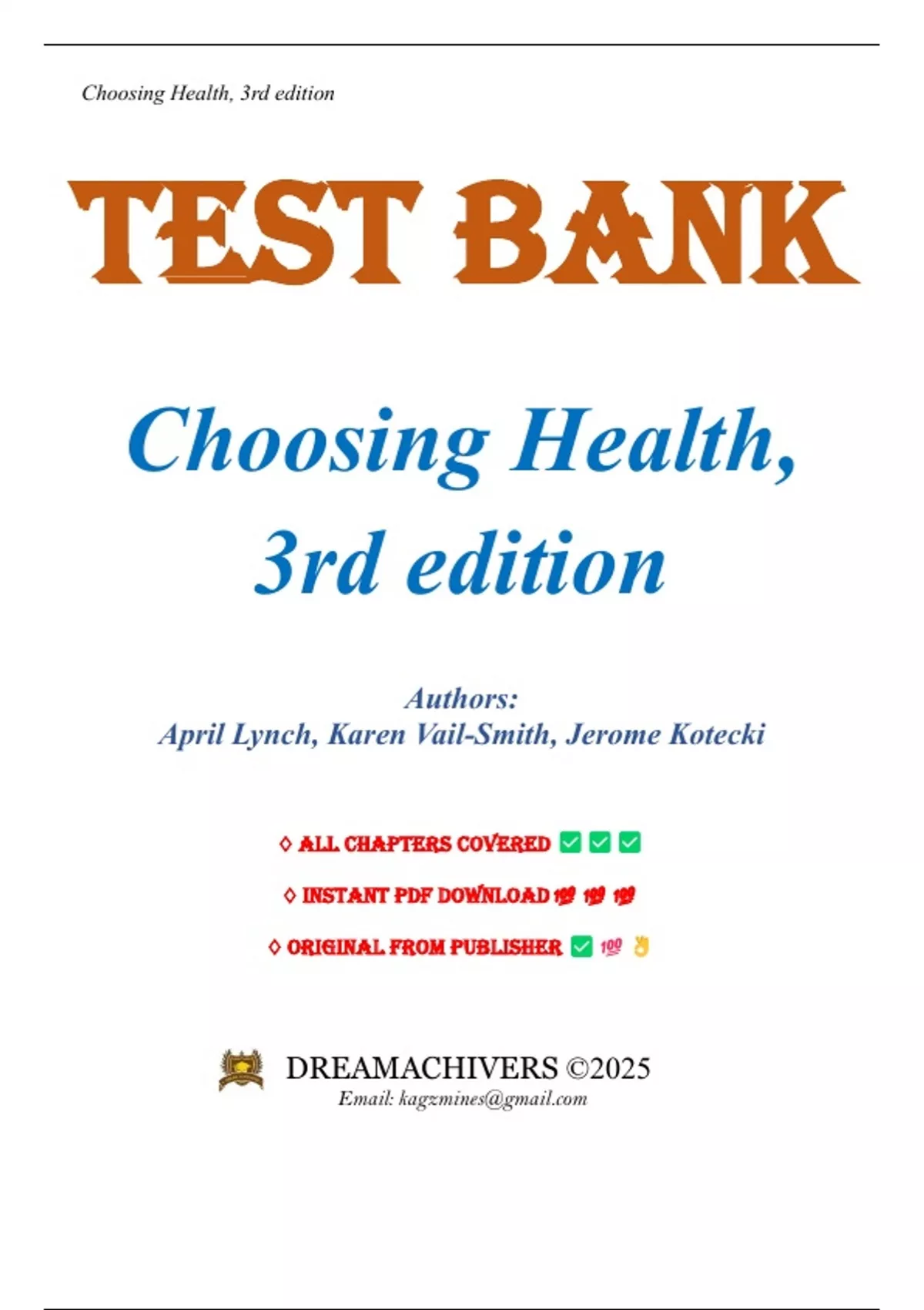 Test Bank for Choosing Health, 3rd edition by April Lynch, Chapters 1-17. Full Chapters Include;....Health in the 21st Century Psychological Health Stress Management Sleep, Your Body, and Your Mind Nutrition Physical Activity for Fitness and Health Body Image, Body Weight Addictions and Drug Use Alcohol and Tobacco Use and Abuse Social Relationships and Communication Sexuality, Contraception, and Reproductive Choices Preventing Infectious Diseases and Sexually Transmitted Infections Diabetes, Cardiovascular Disease, and Cancer Consumer Health Personal Safety and Injury Prevention Additional Electronic Chapters Your Environment, Your Health Aging Well