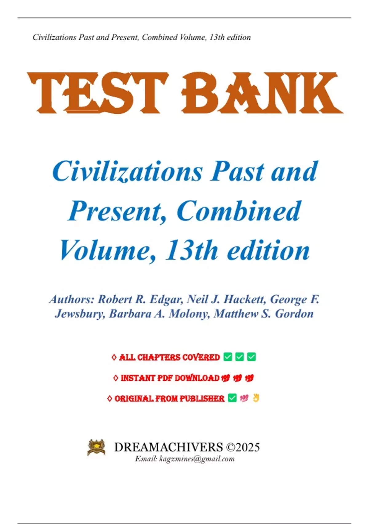 Test Bank For Civilizations Past and Present, Combined Volume 13th Edition by Robert R. Edgar (All Chapters 1-32). Full Chapters Include:,... Stone Age Societies and the Earliest Civilizations of the Near East Early Chinese Civilization Early Indian Civilizations The Greeks 2000-30 BCE Rome, 900 BCE to 476 CE The Eastern Mediterranean World, 300-950 CE The Islamic World, 950-1300 CE African Beginnings The Americas to 1500 The Creation of Europe: 300-1500 Culture, Power, and Trade in the Era of Asian Hegemony, 220-1350 The Great Dynastic Empires of Eurasia, East Asian Cultural and Political Systems, New Ways of Thinking: : Renaissance, Reformations, and Scientific Revolution Global Encounters: Europe and the New World Economy, Europe: The Rise of the Nation States, Africa in the World Economy, Asian and Middle Eastern Empires and Nations, The Americas, The European Century, Africa and the Near East During the Age of European Imperialism Imperialism and Modernity in Asia and the Pacific, The Americas, World War I: The Origins and Consequences of a European Tragedy The Failure of the Liberal Model and the Rise of Authoritarianism World War II Forging New Nations in Asia, National Movements and the Drive for Independence in the Near East and Africa from the 1920s to 1950s The West Since 1945: Cold War and Confused Peace The Near East and Africa Since 1945 Latin America Since 1910 Asia and the South Pacific Since 1945