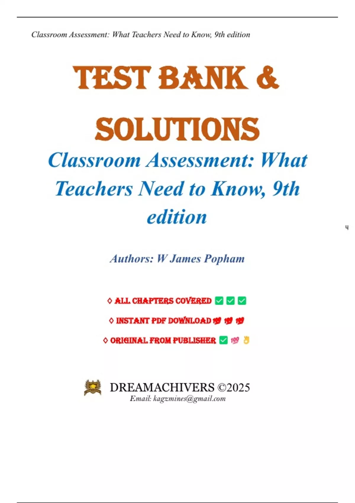 Test Bank & Solutions - Classroom Assessment What Teachers Need to Know 9th Edition By James Popham (All Chapters 1-16)