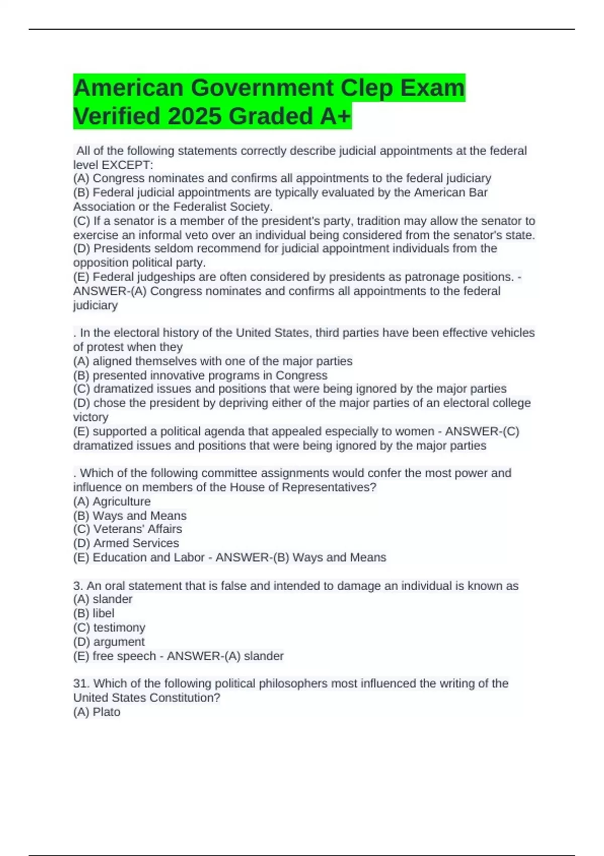 American Government Clep Exam Verified 2025 Graded A+