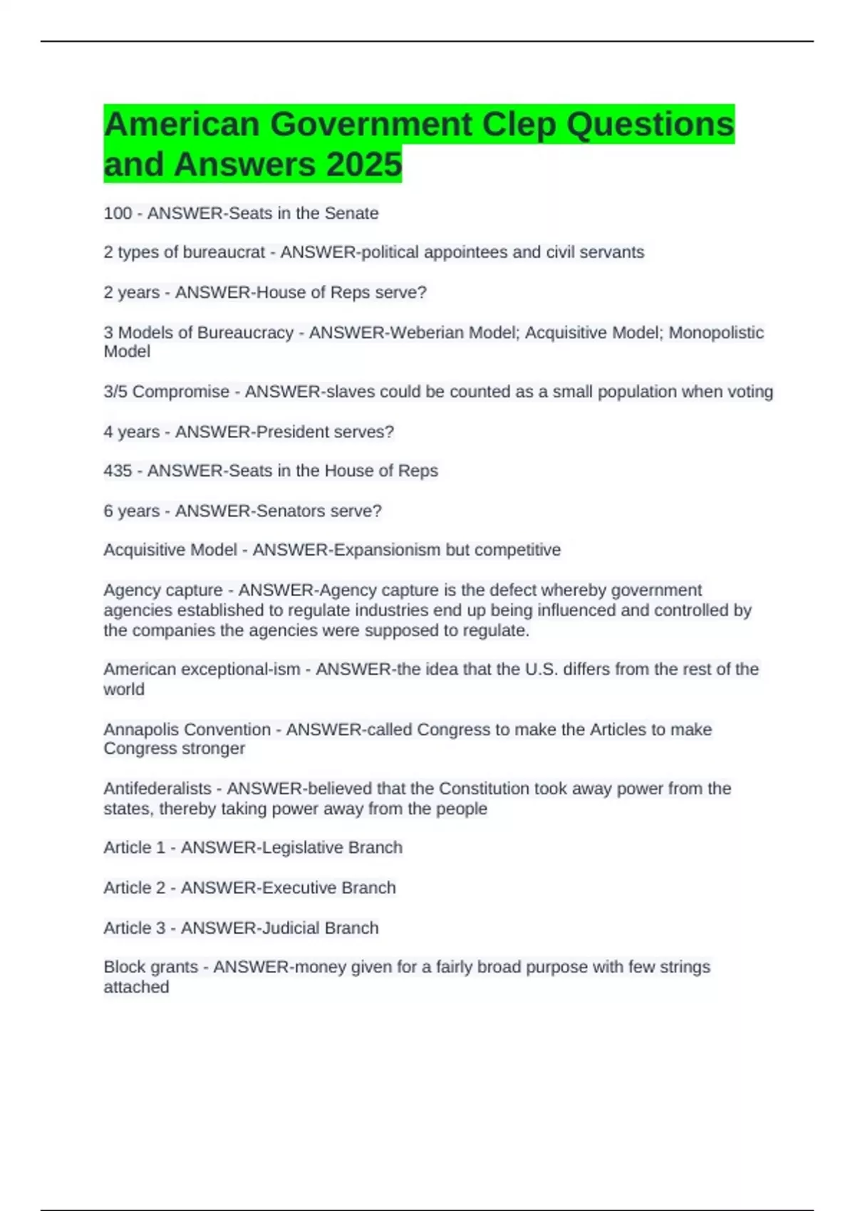 American Government Clep Questions and Answers 2025