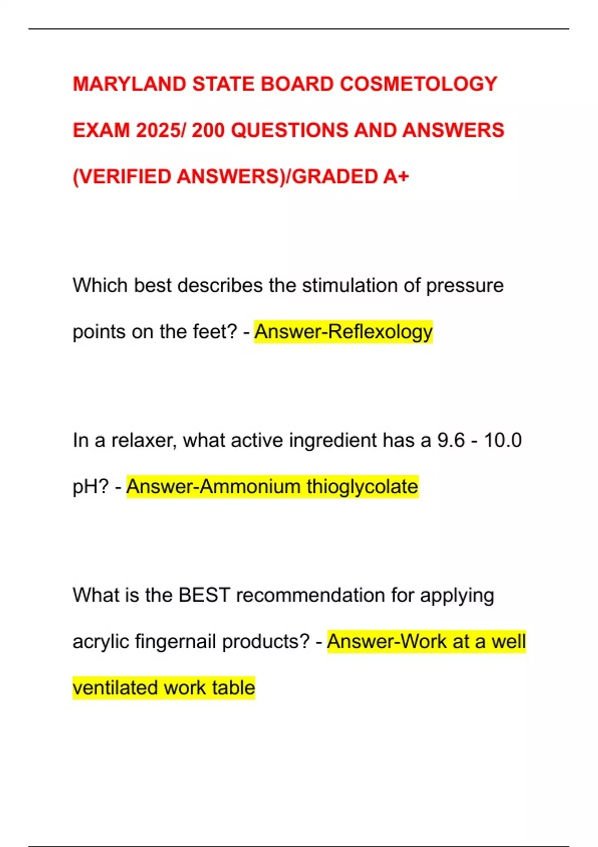 MARYLAND STATE BOARD COSMETOLOGY EXAM 2025/ 200 QUESTIONS AND ANSWERS (VERIFIED ANSWERS)/GRADED A+ Which best describes the stimulation of pressure points on the feet? - Answer-Reflexology In a relaxer, what active ingredient has a 9.6 - 10.0 pH? - Answer-Ammonium thioglycolate What is the BEST recommendation for applying acrylic fingernail products? - Answer-Work at a well ventilated work table What term BEST describes a procedure or condition that may produce undesirable side effects during a scalp massage due to any medical issues a client may have - Answer-Contraindicated What is not considered when using solid form techniques? - Answer-Length What is not needed in the application of a nail wrap? - Answer-A monomer Filler are not used for - Answer-Producing grey coverage For what purpose would the use of hospital grade disinfectants be appropriate? - Answer-To clean blood and bodily fluids off surfaces What is an example of a parasite? - Answer-Scabies What is used to make artificial eyelashes adhere? - Answer-Lash adhesive The stylist's objective is to create the illusion of what face shape? - Answer-Oval