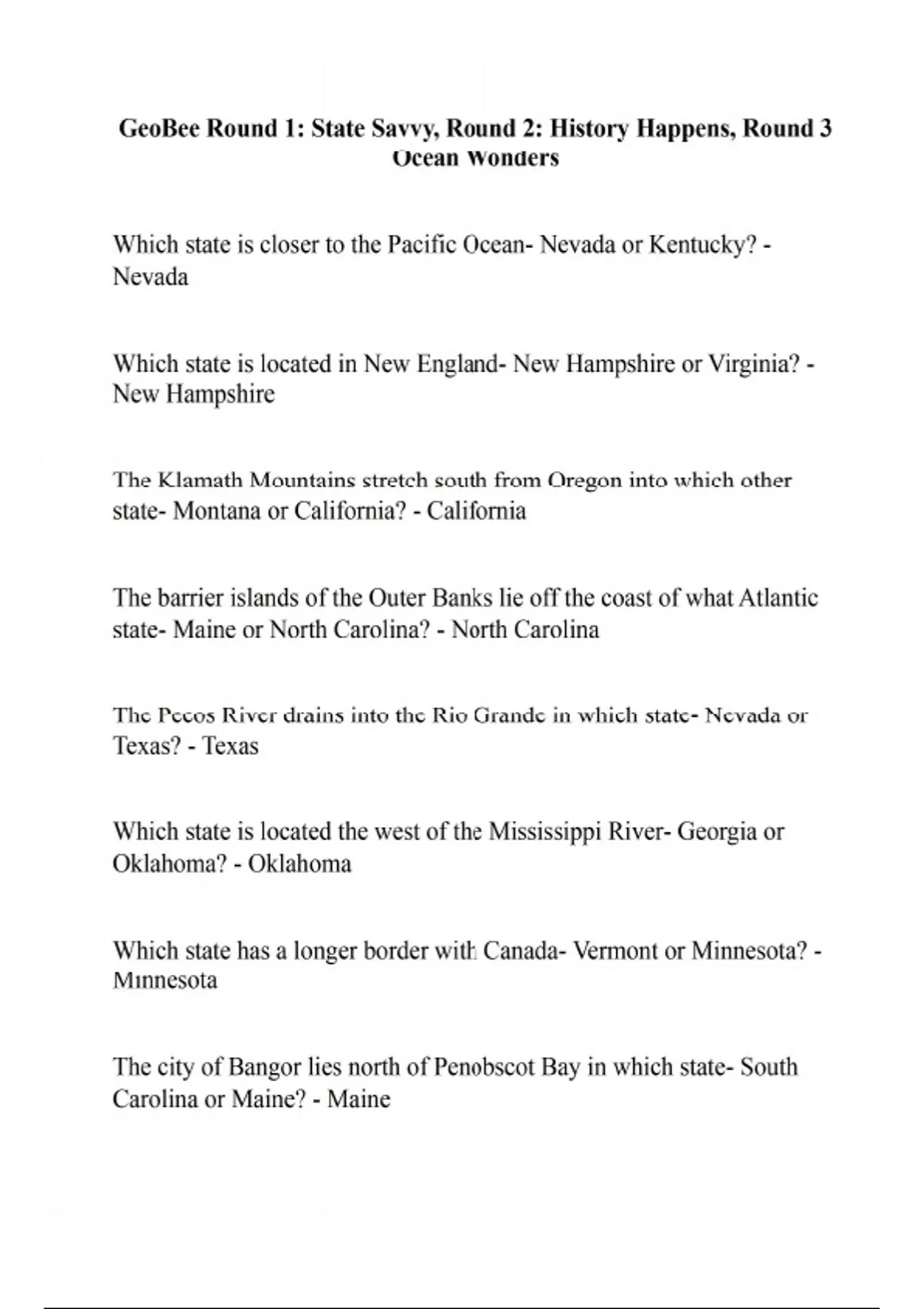Which state is closer to the Pacific Ocean- Nevada or Kentucky? - Nevada Which state is located in New England- New Hampshire or Virginia? - New Hampshire The Klamath Mountains stretch south from Oregon into which other state- Montana or California? - California The barrier islands of the Outer Banks lie off the coast of what Atlantic state- Maine or North Carolina? - North Carolina The Pecos River drains into the Rio Grande in which state- Nevada or Texas? - Texas Which state is located the west of the Mississippi River- Georgia or Oklahoma? - Oklahoma Which state has a longer border with Canada- Vermont or Minnesota? - Minnesota The city of Bangor lies north of Penobscot Bay in which state- South Carolina or Maine? - Maine The Susquehanna River flows through which state on its way to Chesapeake Bay-Connecticut or Pennsylvania? - Pennsylvania Which state is farther north- New Mexico or Michigan? - Michigan Lake Havasu is located on the border between California and which other state-Colorado or Arizona? - Arizona Which state has a humid subtropical climate- South Carolina or South Dakota? - South Carolina The Ozark Plateau covers the southern part of which state- Missouri or Wisconsin? - Missouri Which state is larger in terms of area- Montana or Delaware? - Montana The North Platte and The South Platte River meet in which state- New Mexico or Nebraska? - Nebraska The city of Cincinnati is located in Ohio near the border with which other state-Virginia or Kentucky? - Kentucky The Appalachian Mountains run through which state-Georgia or Mississippi? - Georgia The city or Green Bay lies near the Door Peninsula in which state- Iowa or Winconsin? - Wisconsin Plymouth, site of one of the first successful settlements in the English colonies, is located in which state-Massachusetts or New Jersey? - Massachusetts Which state borders the Gulf of Mexico- South Carolina or Louisana? - Louisianna The city of Topeka lies north of Flint Hills in which state- Kansas or Iowa? - Kansas Lake Semihole is shared by Florida and which other state- Georgia or Tennessee? - Georgia Which state has a shoreline on Lake Erie- Maine or New York? - New York Lake Tahoe lies on the border between California and which other state- Nevada or Washington? - Nevada Which state is in the Corn Belt- Indiana or West Virgina? - Indiana Which state straddles the Tropic of Cancer- Hawaii or Alaska? - Hawaii The city of St. Louis lies on the Mississippi River near the border between Missouri and which other state- Illinois or Minnesota? - Illinois Mount Rushmore is located near Rapid City in which state- Idaho or South Dakota? - South Dakota Washington, D.C., borders with state- Virginia or South Carolina? - Virginia Mesas and buttes are part of which landscape of which state- Utah or New York? - Utah Which state lies directly south of Missouri- Arkansas or New Mexico? - Arkansas Grand Coulee Dam lies on the Columbia River in which state- Wyoming or Washigton? - Washington Which state is located in the Great Plains- Utah or North Dakota? - North Dakota Land in which state was part of the Louisiana Purchase- Delaware or Iowa? - Iowa