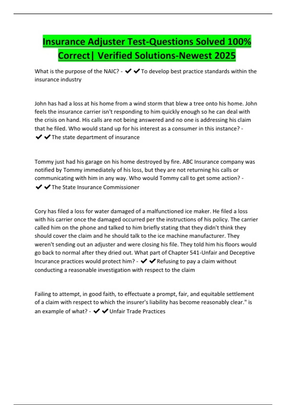 Insurance Adjuster Test-Questions Solved 100%