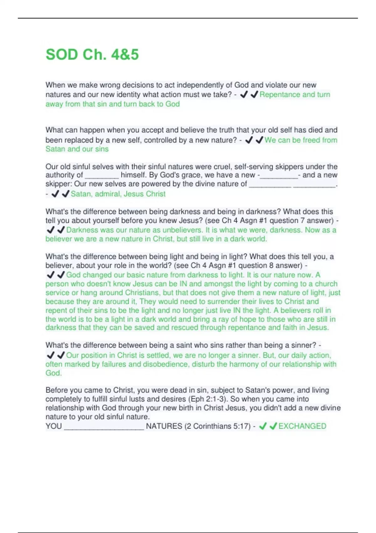 When we make wrong decisions to act independently of God and violate our new natures and our new identity what action must we take? - ️️Repentance and turn away from that sin and turn back to God What can happen when you accept and believe the truth that your old self has died and been replaced by a new self, controlled by a new nature? - ️️We can be freed from Satan and our sins Our old sinful selves with their sinful natures were cruel, self-serving skippers under the authority of ________ himself. By God's grace, we have a new -_________- and a new skipper: Our new selves are powered by the divine nature of __________ __________. - ️️Satan, admiral, Jesus Christ What's the difference between being darkness and being in darkness? What does this tell you about yourself before you knew Jesus? (see Ch 4 Asgn #1 question 7 answer) - ️️Darkness was our nature as unbelievers. It is what we were, darkness. Now as a believer we are a new nature in Christ, but still live in a dark world. What's the difference between being light and being in light? What does this tell you, a believer, about your role in the world? (see Ch 4 Asgn #1 question 8 answer) - ️️God changed our basic nature from darkness to light. It is our nature now. A person who doesn't know Jesus can be IN and amongst the light by coming to a church service or hang around Christians, but that does not give them a new nature of light, just because they are around it, They would need to surrender their lives to Christ and repent of their sins to be the light and no longer just live IN the light. A believers roll in the world is to be a light in a dark world and bring a ray of hope to those who are still in darkness that they can be saved and rescued through repentance and faith in Jesus. What's the difference between being a saint who sins rather than being a sinner? - ️️Our position in Christ is settled, we are no longer a sinner. But, our daily action, often marked by failures and disobedience, disturb the harmony of our relationship with God.