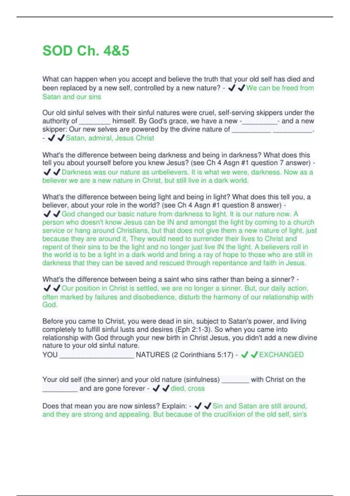 What can happen when you accept and believe the truth that your old self has died and been replaced by a new self, controlled by a new nature? - ️️We can be freed from Satan and our sins Our old sinful selves with their sinful natures were cruel, self-serving skippers under the authority of ________ himself. By God's grace, we have a new -_________- and a new skipper: Our new selves are powered by the divine nature of __________ __________. - ️️Satan, admiral, Jesus Christ What's the difference between being darkness and being in darkness? What does this tell you about yourself before you knew Jesus? (see Ch 4 Asgn #1 question 7 answer) - ️️Darkness was our nature as unbelievers. It is what we were, darkness. Now as a believer we are a new nature in Christ, but still live in a dark world. What's the difference between being light and being in light? What does this tell you, a believer, about your role in the world? (see Ch 4 Asgn #1 question 8 answer) - ️️God changed our basic nature from darkness to light. It is our nature now. A person who doesn't know Jesus can be IN and amongst the light by coming to a church service or hang around Christians, but that does not give them a new nature of light, just because they are around it, They would need to surrender their lives to Christ and repent of their sins to be the light and no longer just live IN the light. A believers roll in the world is to be a light in a dark world and bring a ray of hope to those who are still in darkness that they can be saved and rescued through repentance and faith in Jesus. What's the difference between being a saint who sins rather than being a sinner? - ️️Our position in Christ is settled, we are no longer a sinner. But, our daily action, often marked by failures and disobedience, disturb the harmony of our relationship with God. Before you came to Christ, you were dead in sin, subject to Satan's power, and living completely to fulfill sinful lusts and desires (Eph 2:1-3). So when you came into relationship with God through your new birth in Christ Jesus, you didn't add a new divine nature to your old sinful nature. YOU ___________________ NATURES (2 Corinthians 5:17) - ️️EXCHANGED