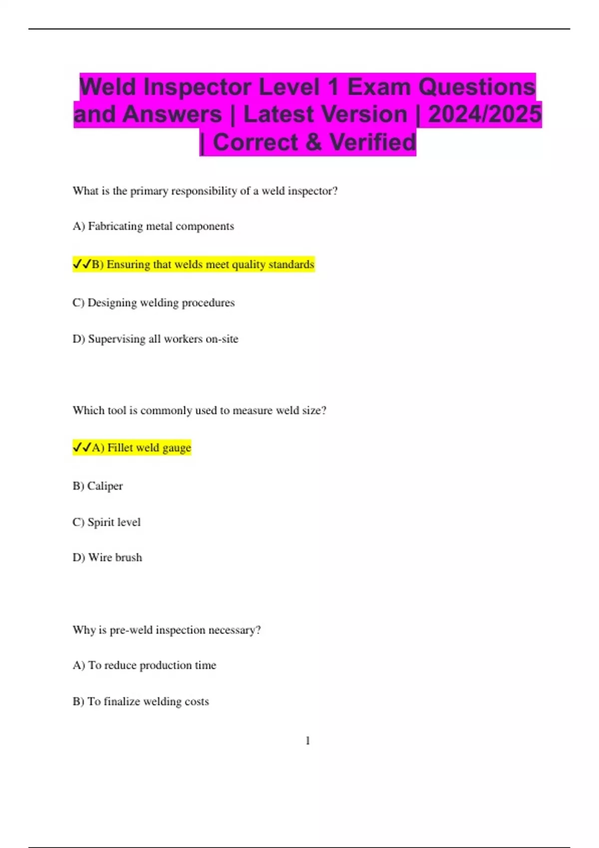 Weld Inspector Level 1 Exam Questions and Answers | Latest Version | 2024/2025 | Correct & Verified What is the primary responsibility of a weld inspector? A) Fabricating metal components B) Ensuring that welds meet quality standards C) Designing welding procedures D) Supervising all workers on-site Which tool is commonly used to measure weld size? A) Fillet weld gauge B) Caliper C) Spirit level D) Wire brush Why is pre-weld inspection necessary? A) To reduce production time B) To finalize welding costs 2 C) To verify materials and joint preparation D) To identify potential supervisors What is porosity in a weld? A) Excess metal on the weld surface B) An uneven weld bead C) Gas pockets trapped in the weld metal D) A defect caused by improper shielding gas What type of test is used to check weld strength without causing damage? A) Destructive testing B) Non-destructive testing (NDT) C) Mechanical testing D) Thermal analysis What does a visual inspection of a weld typically include? A) Examining for surface defects, alignment, and weld profile B) Measuring heat input during welding 3 C) Testing the tensile strength of the weld D) Assessing the welder’s skill level What is the role of shielding gas in welding? A) Protecting the weld pool from atmospheric contamination B) Cooling the weld metal C) Increasing welding speed D) Cleaning the base metal before welding Which defect is characterized by a groove at the weld toe? A) Undercut B) Porosity C) Slag inclusion D) Overlap Why is post-weld heat treatment (PWHT) sometimes necessary? A) To relieve residual stresses and enhance weld properties