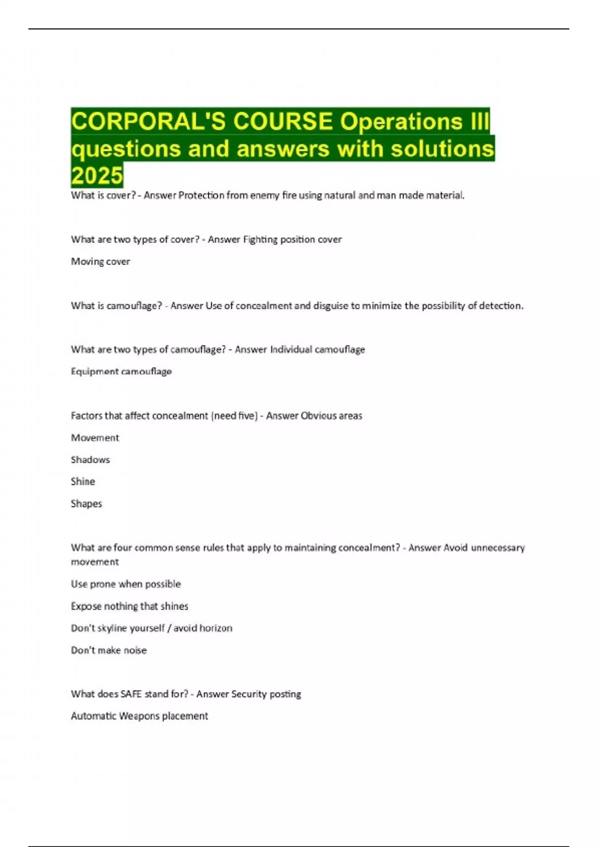 What is cover? - Answer Protection from enemy fire using natural and man made material. What are two types of cover? - Answer Fighting position cover Moving cover What is camouflage? - Answer Use of concealment and disguise to minimize the possibility of detection. What are two types of camouflage? - Answer Individual camouflage Equipment camouflage Factors that affect concealment (need five) - Answer Obvious areas Movement Shadows Shine Shapes What are four common sense rules that apply to maintaining concealment? - Answer Avoid unnecessary movement Use prone when possible Expose nothing that shines Don't skyline yourself / avoid horizon Don't make noise What does SAFE stand for? - Answer Security posting Automatic Weapons placement Fields of Fire, Entrenchment