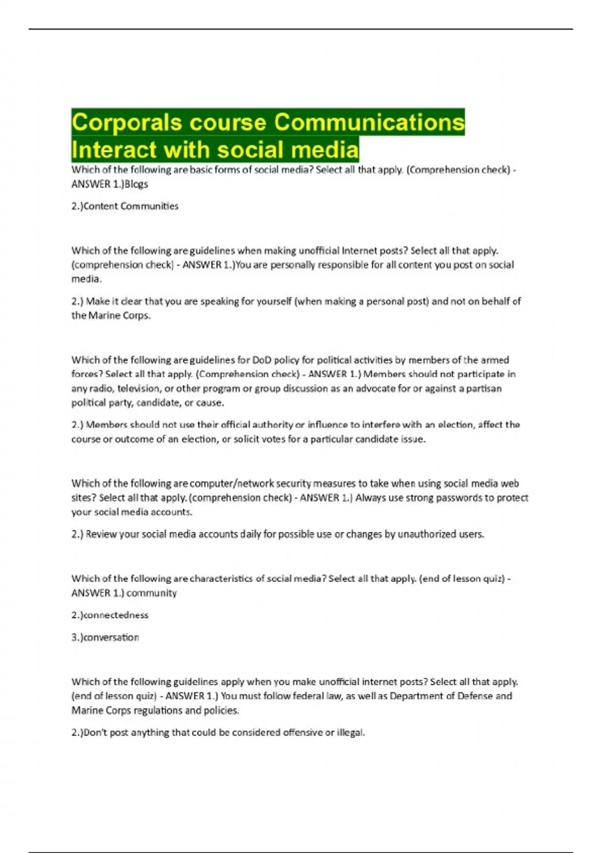 Which of the following are basic forms of social media? Select all that apply. (Comprehension check) - ANSWER 1.)Blogs 2.)Content Communities Which of the following are guidelines when making unofficial Internet posts? Select all that apply. (comprehension check) - ANSWER 1.)You are personally responsible for all content you post on social media. 2.) Make it clear that you are speaking for yourself (when making a personal post) and not on behalf of the Marine Corps. Which of the following are guidelines for DoD policy for political activities by members of the armed forces? Select all that apply. (Comprehension check) - ANSWER 1.) Members should not participate in any radio, television, or other program or group discussion as an advocate for or against a partisan political party, candidate, or cause. 2.) Members should not use their official authority or influence to interfere with an election, affect the course or outcome of an election, or solicit votes for a particular candidate issue. Which of the following are computer/network security measures to take when using social media web sites? Select all that apply. (comprehension check) - ANSWER 1.) Always use strong passwords to protect your social media accounts. 2.) Review your social media accounts daily for possible use or changes by unauthorized users. Which of the following are characteristics of social media? Select all that apply. (end of lesson quiz) - ANSWER 1.) community 2.)connectedness 3.)conversation