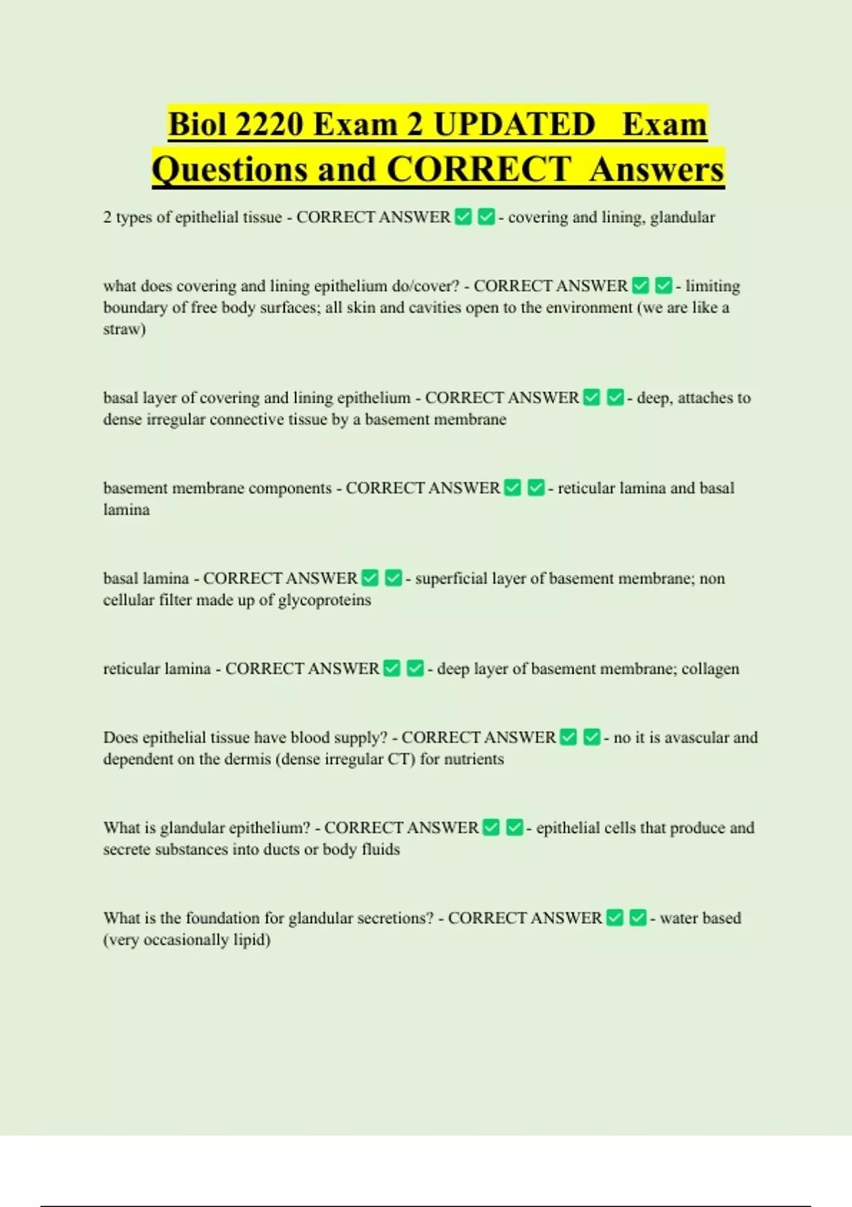 Biol 2220 Exam 2 UPDATED Exam Questions and CORRECT Answers 2 types of epithelial tissue - CORRECT ANSWER - covering and lining, glandular what does covering and lining epithelium do/cover? - CORRECT ANSWER - limiting boundary of free body surfaces; all skin and cavities open to the environment (we are like a straw