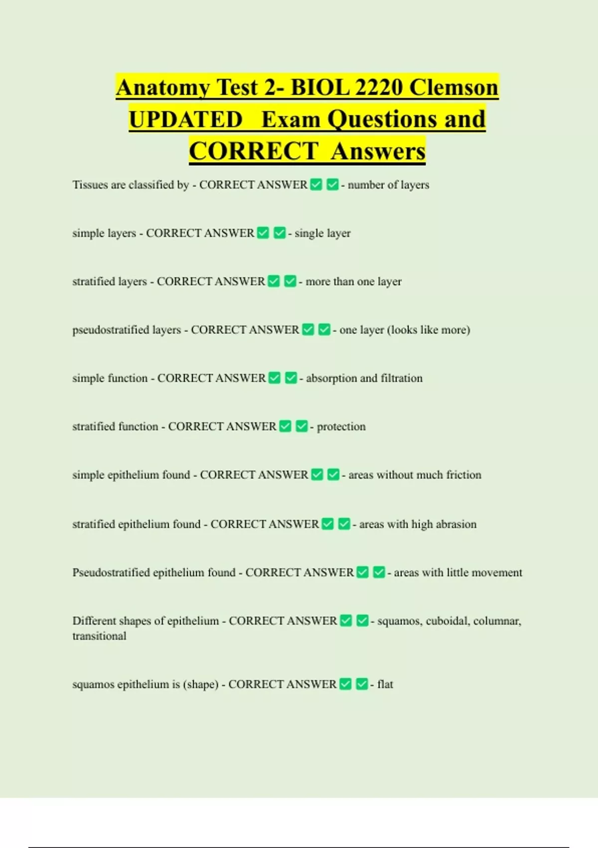 Anatomy Test 2- BIOL 2220 Clemson UPDATED Exam Questions and CORRECT Answers Tissues are classified by - CORRECT ANSWER - number of layers simple layers - CORRECT ANSWER - single layer stratified layers - CORRECT ANSWER - more than one layer