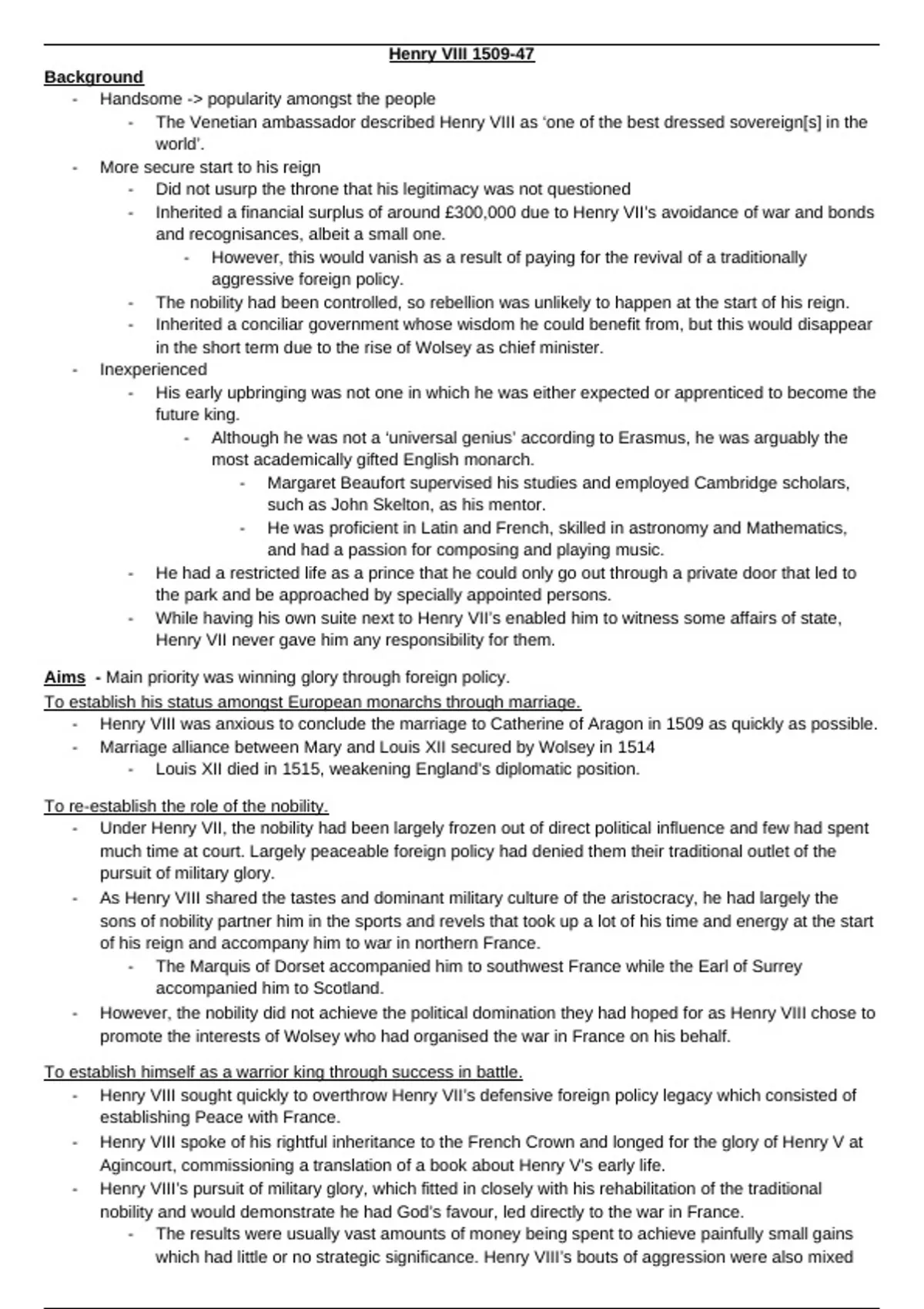This is a detailed summary Henry VIII's domestic policies created using the 'Oxford AQA History Textbook for A Level: The Tudors: England ' by Sally Waller, 'Access to History: The Early Tudors: Henry VII to Mary I, Second Edition' by Roger Turvey, as well as lesson notes from an Oxford-educated history teacher. The summary categorises information under subheadings and presents information precisely and concisely in short paragraphs/bullet points. Useful statistics are included for you to demonstrate specific knowledge in essays. Overall, the summary provides more than sufficient points needed for whatever essay topic on Henry VII's domestic policies that you encounter. The summary has helped lead to an A* grade for AQA History 1C The Tudors: England, .