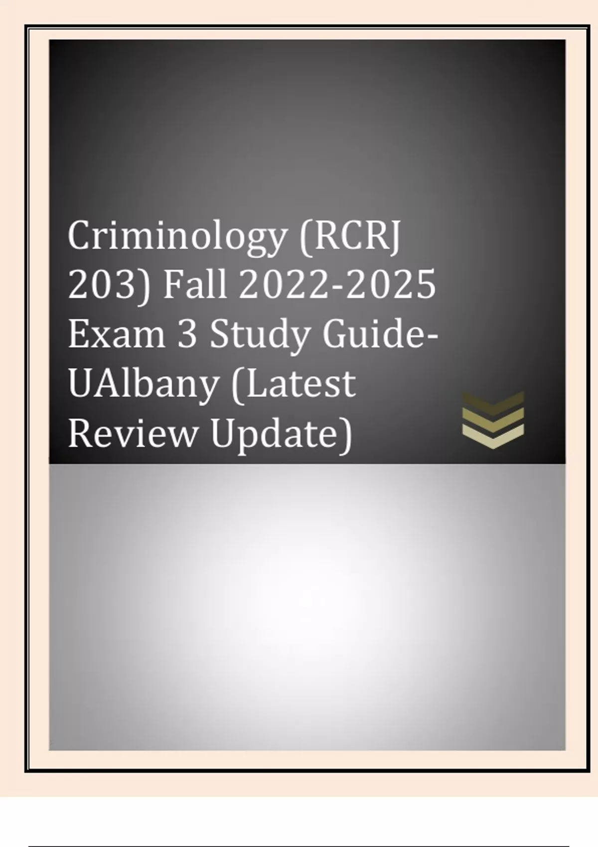 Criminology (RCRJ 203) Fall Exam 3 Study GuideUAlbany (Latest Review Update) Mainstream Criminology - ANS-Emphasis on criminal behavior and why people do it; doesn't focus on why it's illegal; assumes consensus worldview, where we all agree on what is right or wrong - Pathology, positivism Objectivism use of scientific method to study and help reduce crime Critical Criminology - ANS-Subordinate Ideology - self-conscious critique of power - Brought on in part by realization that criminal offending is ubiquitous, but we don't all get arrested or treated the same - Asks why certain behaviors are legal in some places but illegal in others 1. Why is law enforced against certain types of people 2. How might does enforcement of law help contribute to crime Asks why criminal justice system is inequality applied Critical Criminology as Ideology - ANS-Circumstances 1. Got idea based on turbulent situation in 1960s and 70s 2. Widespread public questioning of legal authority 3. Radical Social Climate (Kent State massacre against Vietnam Protestors); Emergence of counter-culture (hippies) people who thought victimless crime and promiscuous sex was harmless even though they were criminalized; over a decade of protests for civil rights These 3 things came together to question the benevolence of police Saints & Roughnecks - ANS-