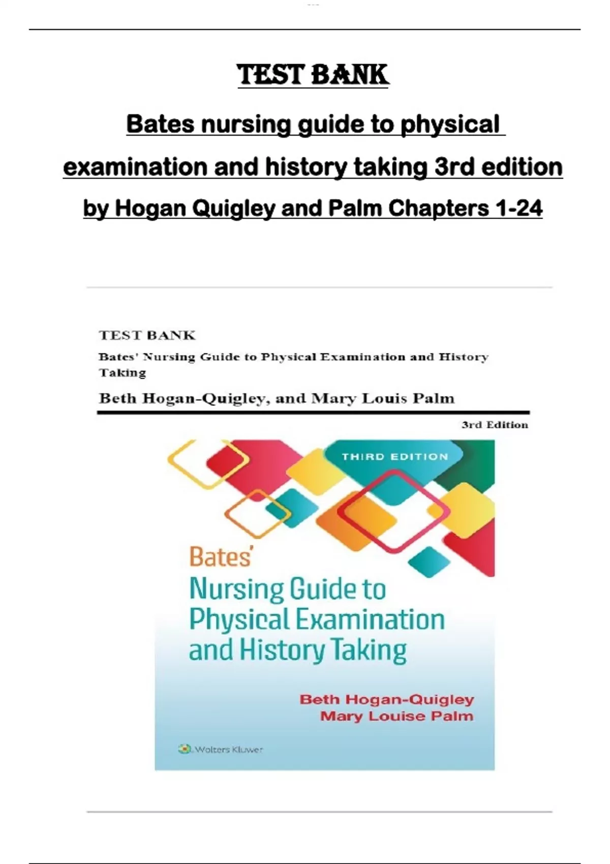 TEST BANK for Bates nursing guide to physical examination and history taking 3rd edition by Hogan Quigley and Palm Chapters 1-24