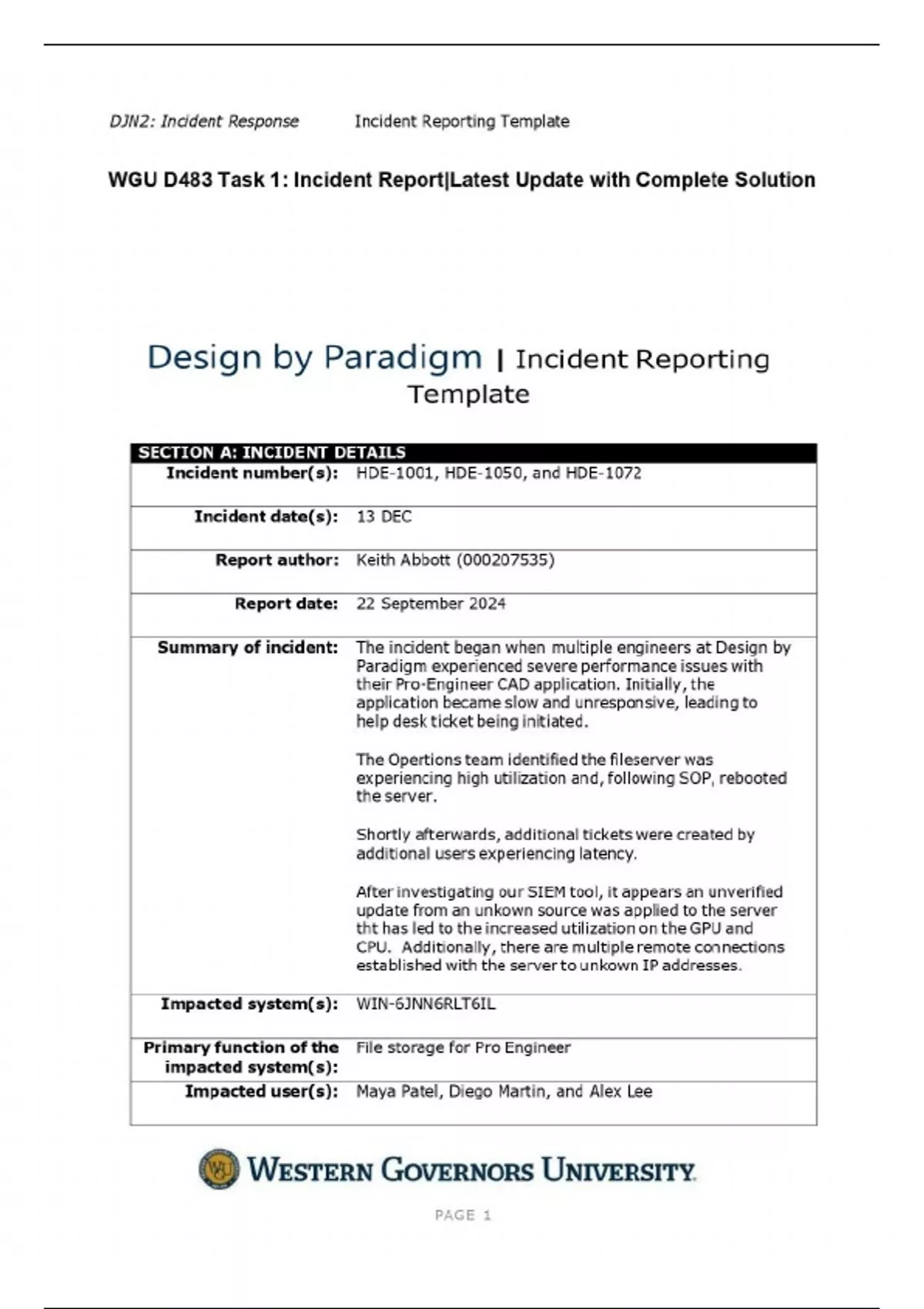 WGU D483 Task 1: Incident Report|Latest Update with Complete Solution