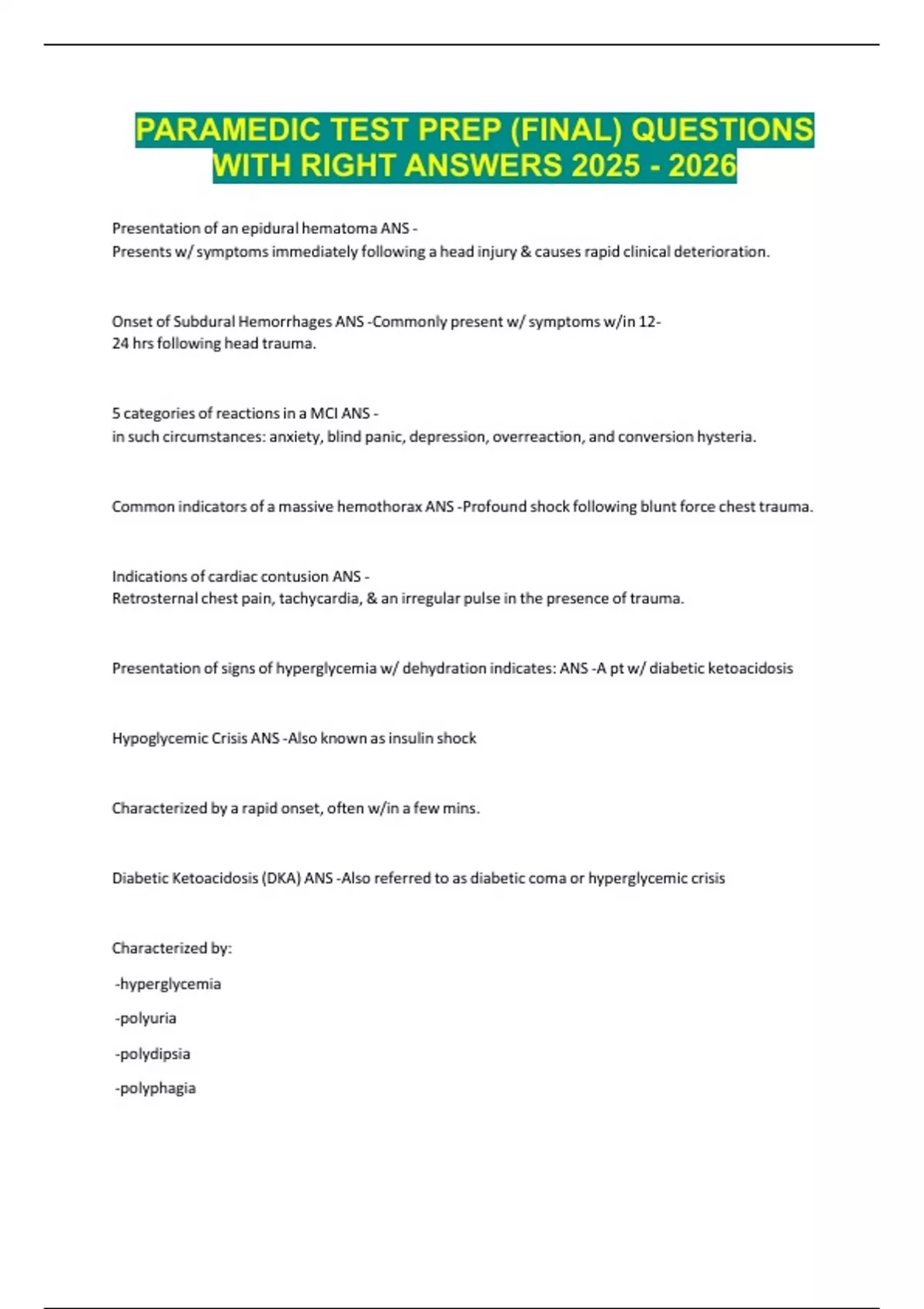 PARAMEDIC TEST PREP (FINAL) QUESTIONS WITH RIGHT ANSWERS