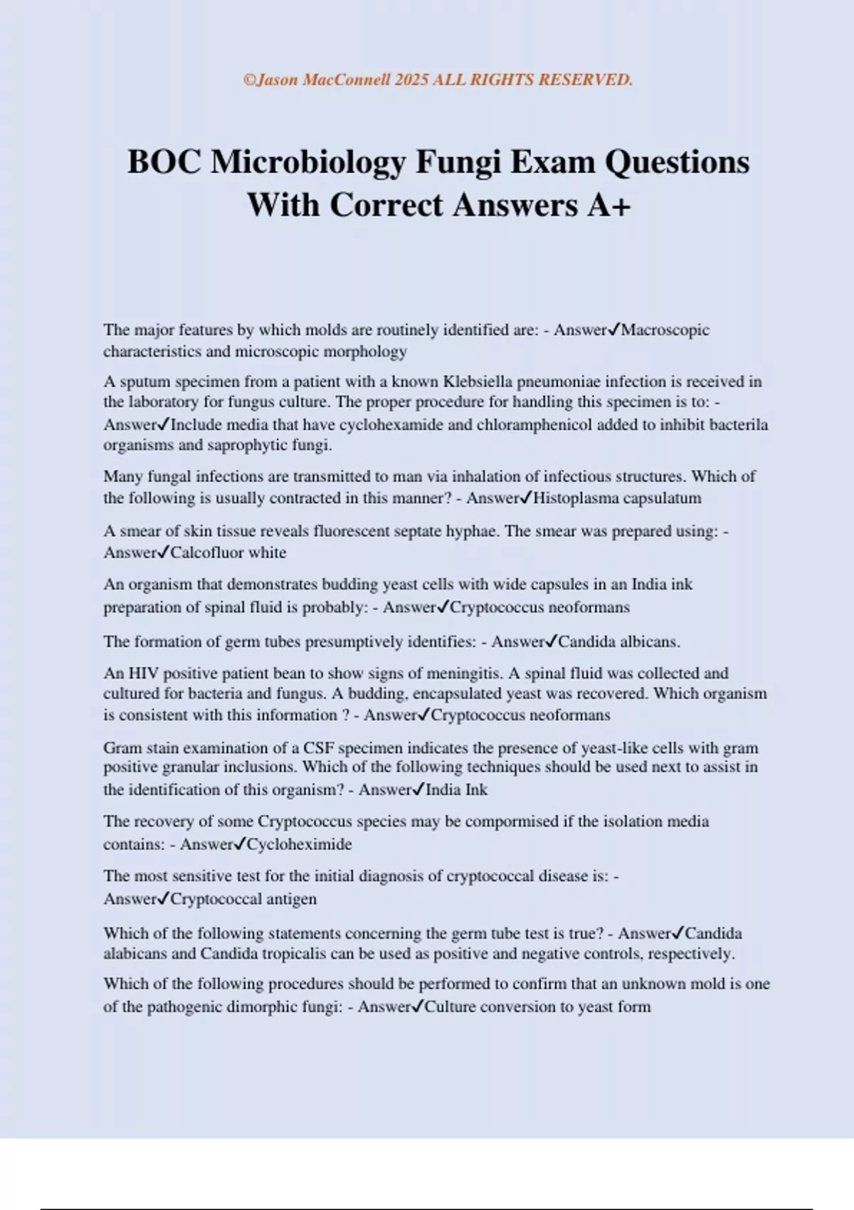 BOC Microbiology Fungi Exam Questions With Correct Answers A+