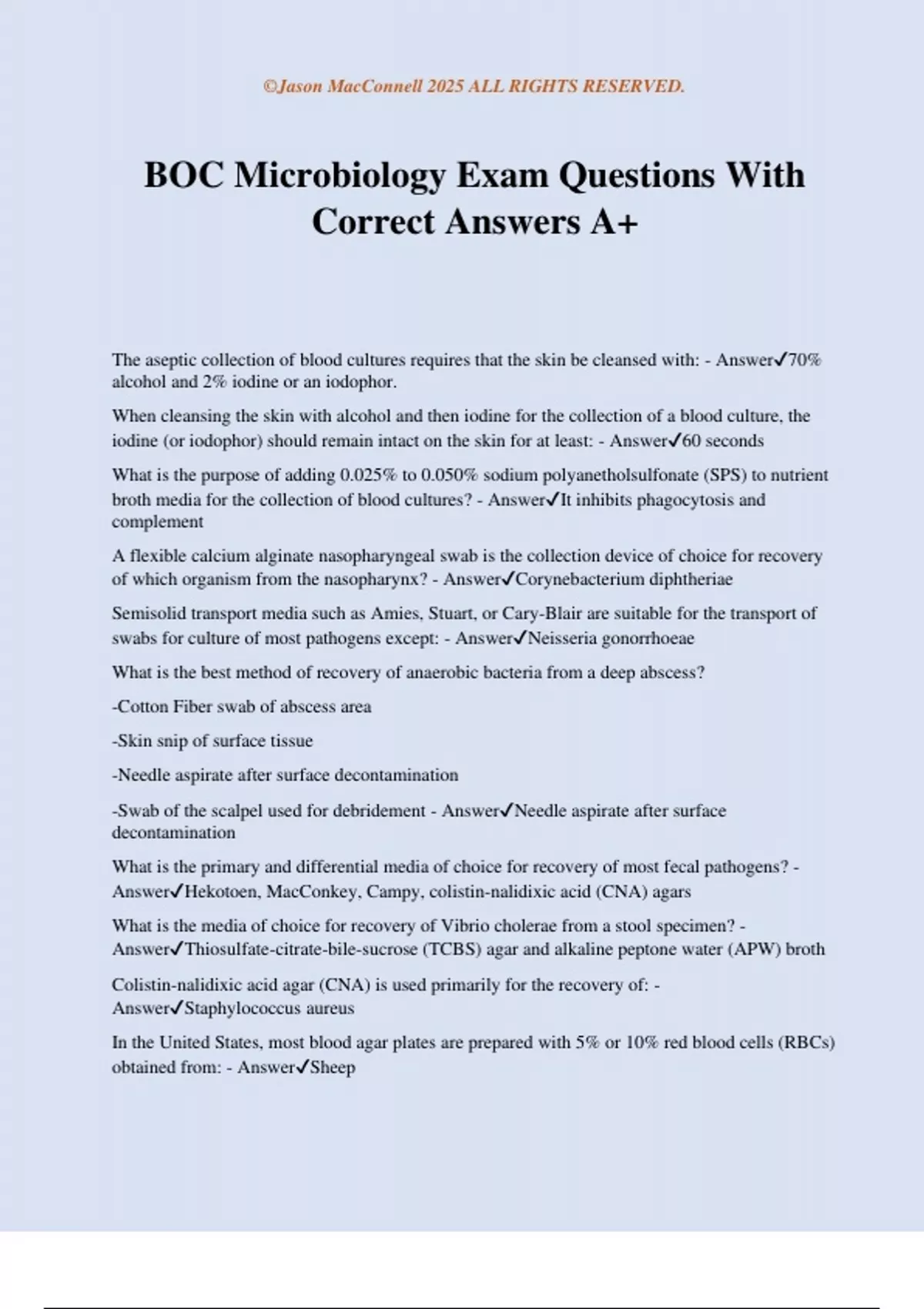 BOC Microbiology Exam Questions With Correct Answers A+ The aseptic collection of blood cultures requires that the skin be cleansed with: - Answer70% alcohol and 2% iodine or an iodophor. When cleansing the skin with alcohol and then iodine for the collection of a blood culture, the iodine (or iodophor) should remain intact on the skin for at least: - Answer60 seconds What is the purpose of adding 0.025% to 0.050% sodium polyanetholsulfonate (SPS) to nutrient broth media for the collection of blood cultures? - AnswerIt inhibits phagocytosis and complement A flexible calcium alginate nasopharyngeal swab is the collection device of choice for recovery of which organism from the nasopharynx? - AnswerCorynebacterium diphtheriae Semisolid transport media such as Amies, Stuart, or Cary-Blair are suitable for the transport of swabs for culture of most pathogens except: - AnswerNeisseria gonorrhoeae What is the best method of recovery of anaerobic bacteria from a deep abscess? -Cotton Fiber swab of abscess area -Skin snip of surface tissue -Needle aspirate after surface decontamination -Swab of the scalpel used for debridement - AnswerNeedle aspirate after surface decontamination What is the primary and differential media of choice for recovery of most fecal pathogens? - AnswerHekotoen, MacConkey, Campy, colistin-nalidixic acid (CNA) agars What is the media of choice for recovery of Vibrio cholerae from a stool specimen? - AnswerThiosulfate-citrate-bile-sucrose (TCBS) agar and alkaline peptone water (APW) broth Colistin-nalidixic acid agar (CNA) is used primarily for the recovery of: - AnswerStaphylococcus aureus In the United States, most blood agar plates are prepared with 5% or 10% red blood cells (RBCs) obtained from: - AnswerSheep