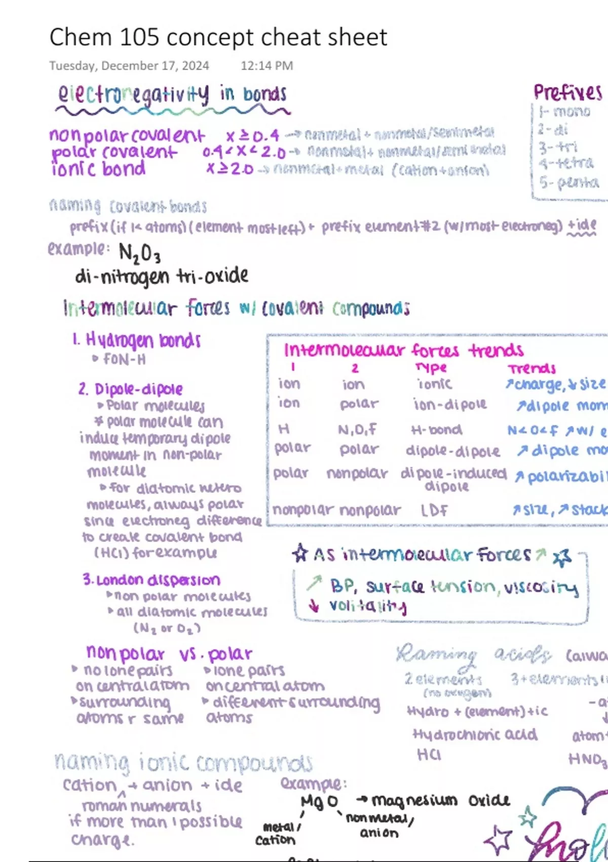 This concept cheat sheet covers all major chem 105 concepts such as molecular geometry, intermolecular forces, molecular orbital theory, isomers, bond order, phase diagrams, types of bonds.