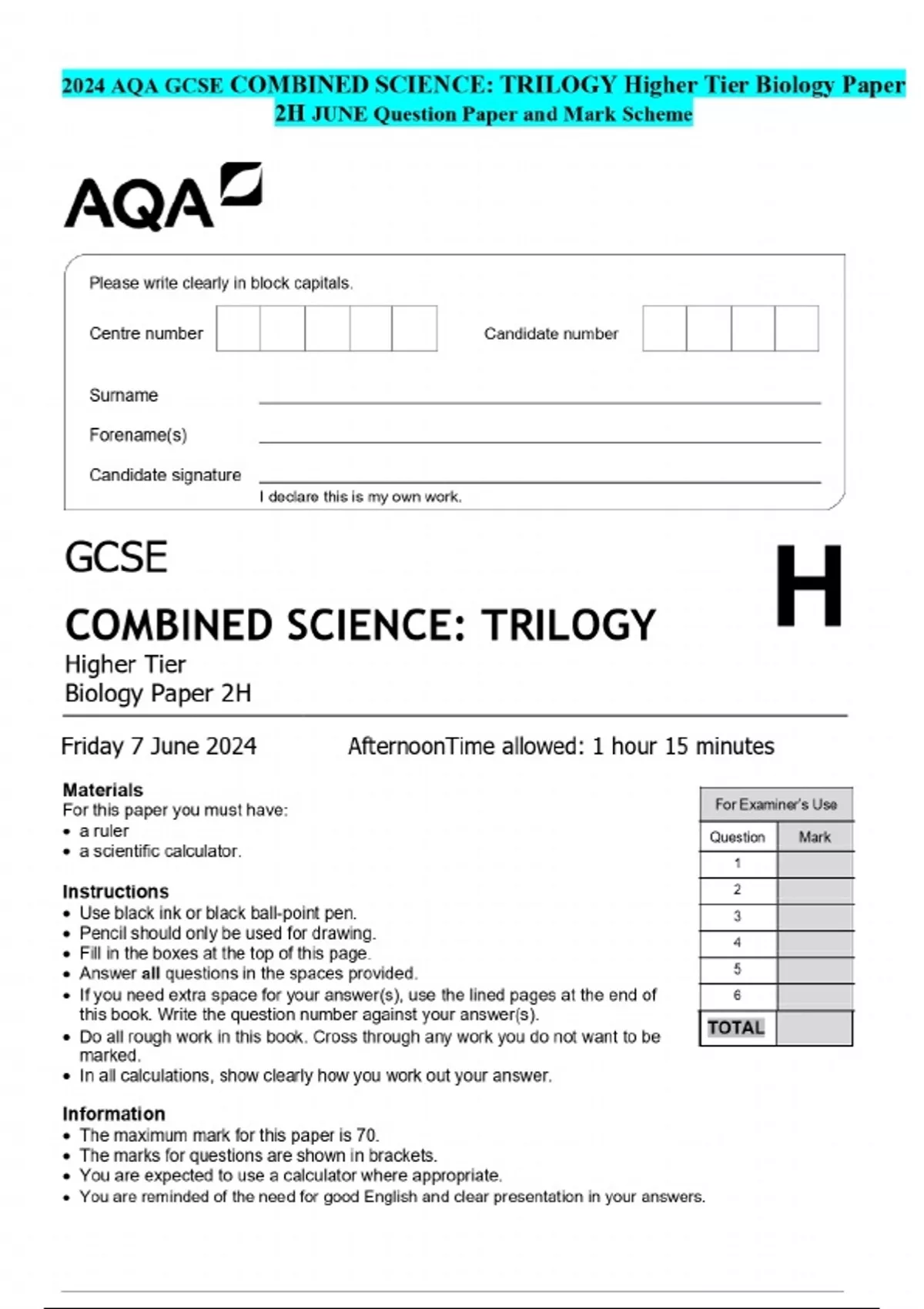 2024 AQA GCSE COMBINED SCIENCE: TRILOGY Higher Tier Biology Paper 2H JUNE Question Paper and Mark Scheme