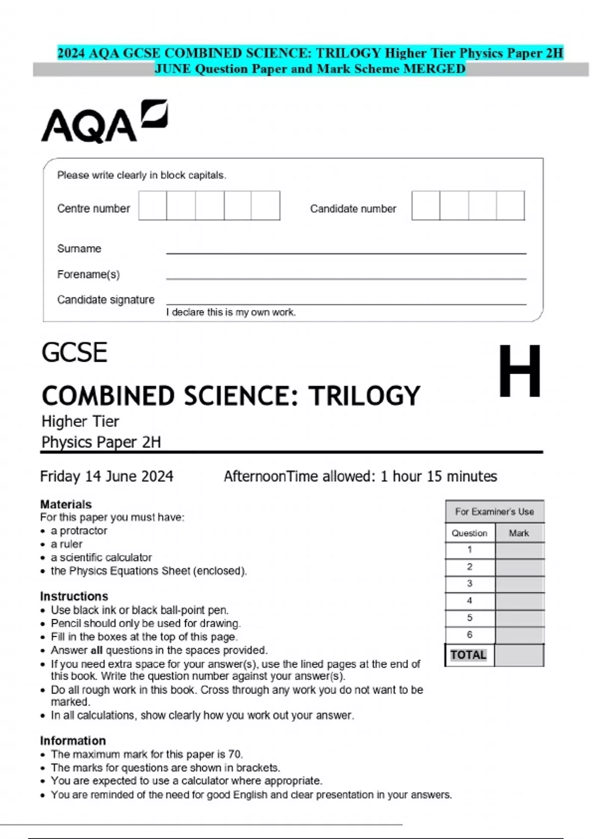 2024 AQA GCSE COMBINED SCIENCE: TRILOGY Higher Tier Physics Paper 2H JUNE Question Paper and Mark Scheme MERGED