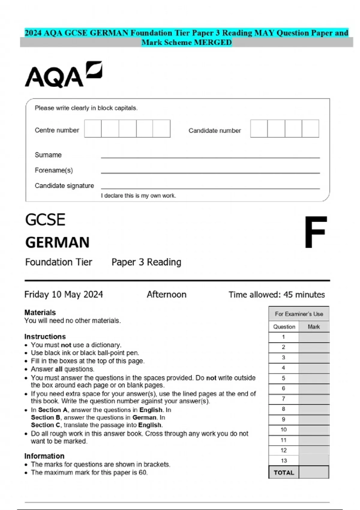 EXAMS BUNDLE:::::2024 AQA GCSE GERMAN Foundation Tier | Question Papers and Mark Scheme MERGED