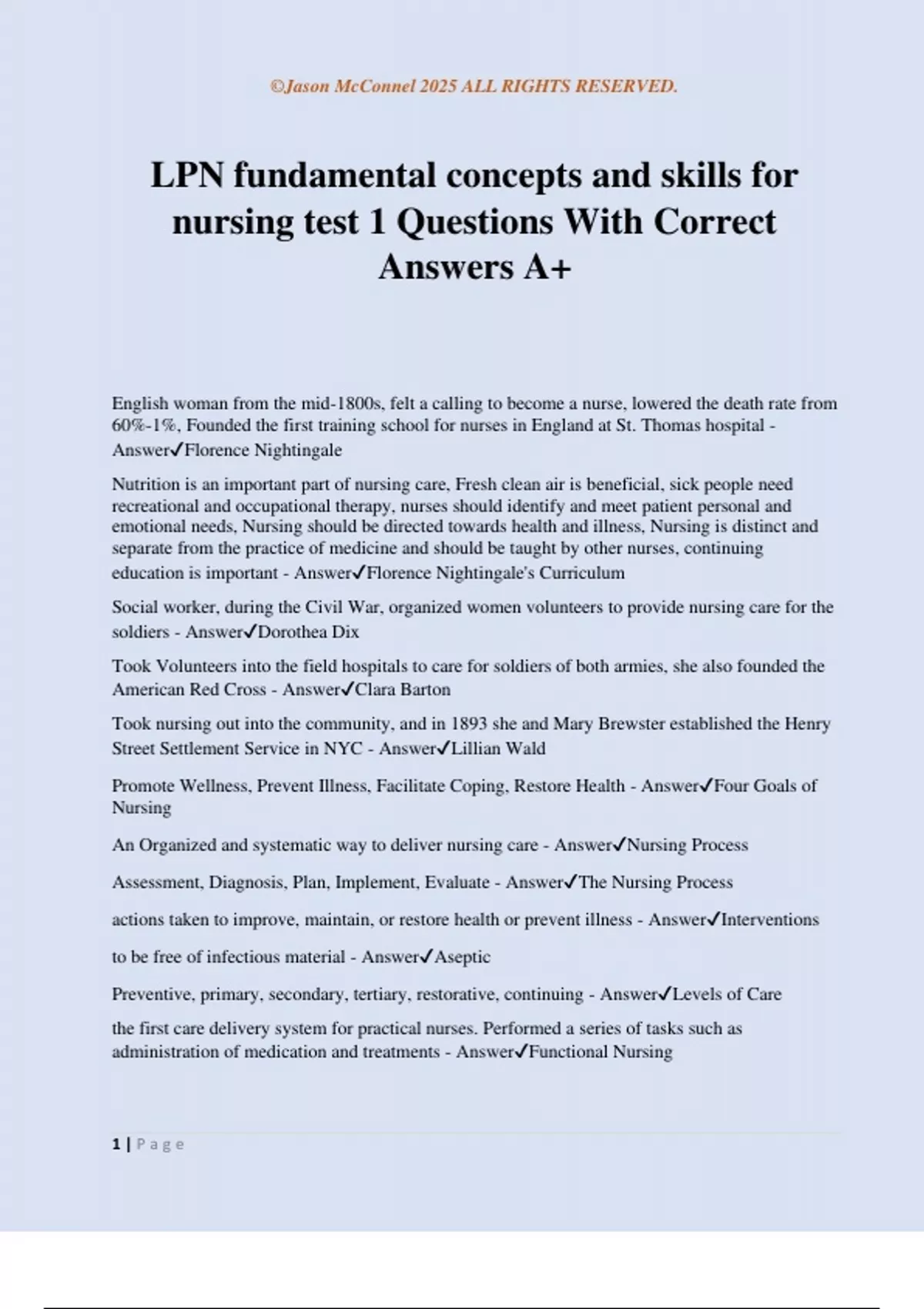 LPN fundamental concepts and skills for nursing test 1 Questions With Correct Answers A+ English woman from the mid-1800s, felt a calling to become a nurse, lowered the death rate from 60%-1%, Founded the first training school for nurses in England at St. Thomas hospital - AnswerFlorence Nightingale Nutrition is an important part of nursing care, Fresh clean air is beneficial, sick people need recreational and occupational therapy, nurses should identify and meet patient personal and emotional needs, Nursing should be directed towards health and illness, Nursing is distinct and separate from the practice of medicine and should be taught by other nurses, continuing education is important - AnswerFlorence Nightingale's Curriculum Social worker, during the Civil War, organized women volunteers to provide nursing care for the soldiers - AnswerDorothea Dix Took Volunteers into the field hospitals to care for soldiers of both armies, she also founded the American Red Cross - AnswerClara Barton Took nursing out into the community, and in 1893 she and Mary Brewster established the Henry Street Settlement Service in NYC - AnswerLillian Wald Promote Wellness, Prevent Illness, Facilitate Coping, Restore Health - AnswerFour Goals of Nursing An Organized and systematic way to deliver nursing care - AnswerNursing Process Assessment, Diagnosis, Plan, Implement, Evaluate - AnswerThe Nursing Process actions taken to improve, maintain, or restore health or prevent illness - AnswerInterventions to be free of infectious material - AnswerAseptic Preventive, primary, secondary, tertiary, restorative, continuing - AnswerLevels of Care the first care delivery system for practical nurses. Performed a series of tasks such as administration of medication and treatments - AnswerFunctional Nursing