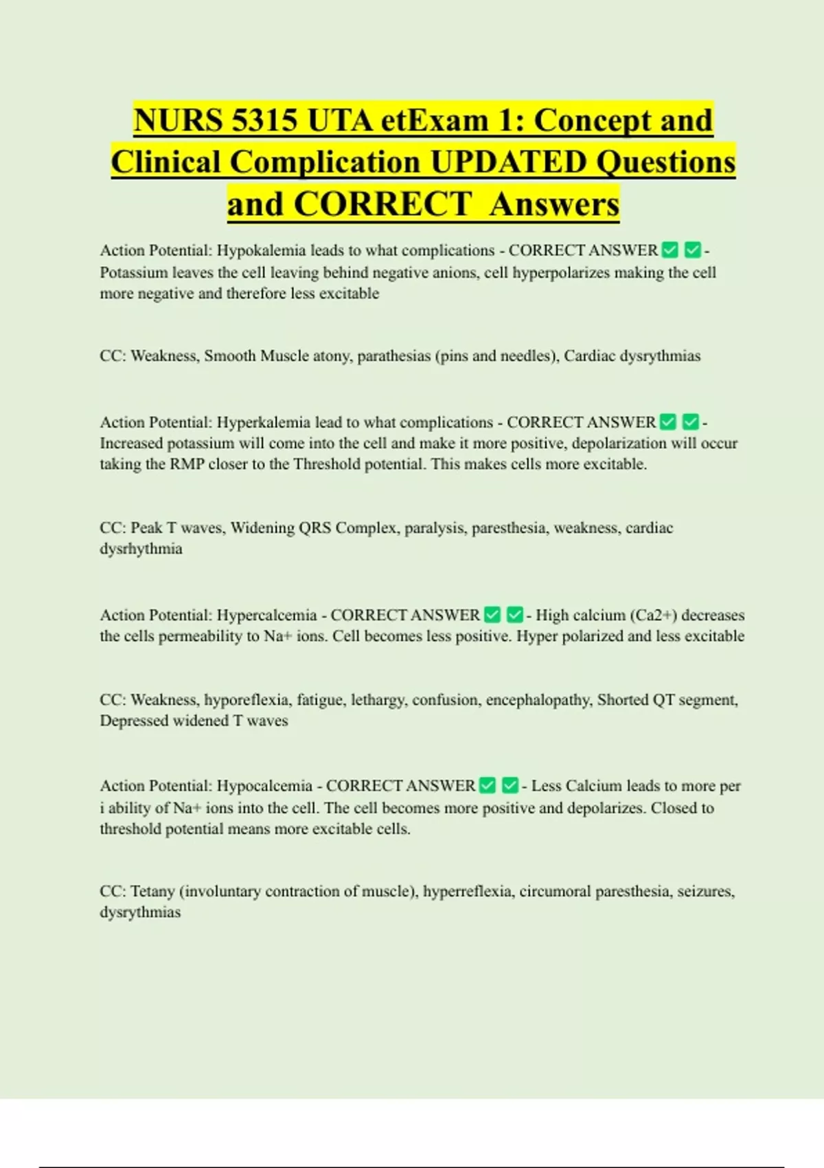 NURS 5315 UTA etExam 1: Concept and Clinical Complication UPDATED Questions and CORRECT Answers Action Potential: Hypokalemia leads to what complications - CORRECT ANSWER - Potassium leaves the cell leaving behind negative anions, cell hyperpolarizes making the cell more negative and therefore less excitable CC: Weakness, Smooth Muscle atony, parathesias (pins and needles), Cardiac dysrythmias